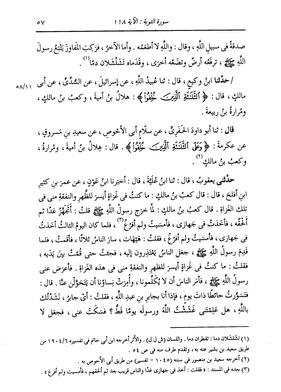 قَالَ: ثَنَا أَبُو دَاوُدَ الْحَفَرِيُّ، عَنْ سَلَّامٍ أَبِي الْأَحْوَصِ، عَنْ سَعِيدِ بْنِ مَسْرُوقٍ، عَنْ عِكْرِمَةَ، " {§وَعَلَى الثَّلَاثَةِ الَّذِينَ خُلِّفُوا} [التوبة: 118] قَالَ: هِلَالُ بْنُ أُمَيَّةَ، ومَرَارَةُ، وَكَعْبُ بْنُ مَالِكٍ "