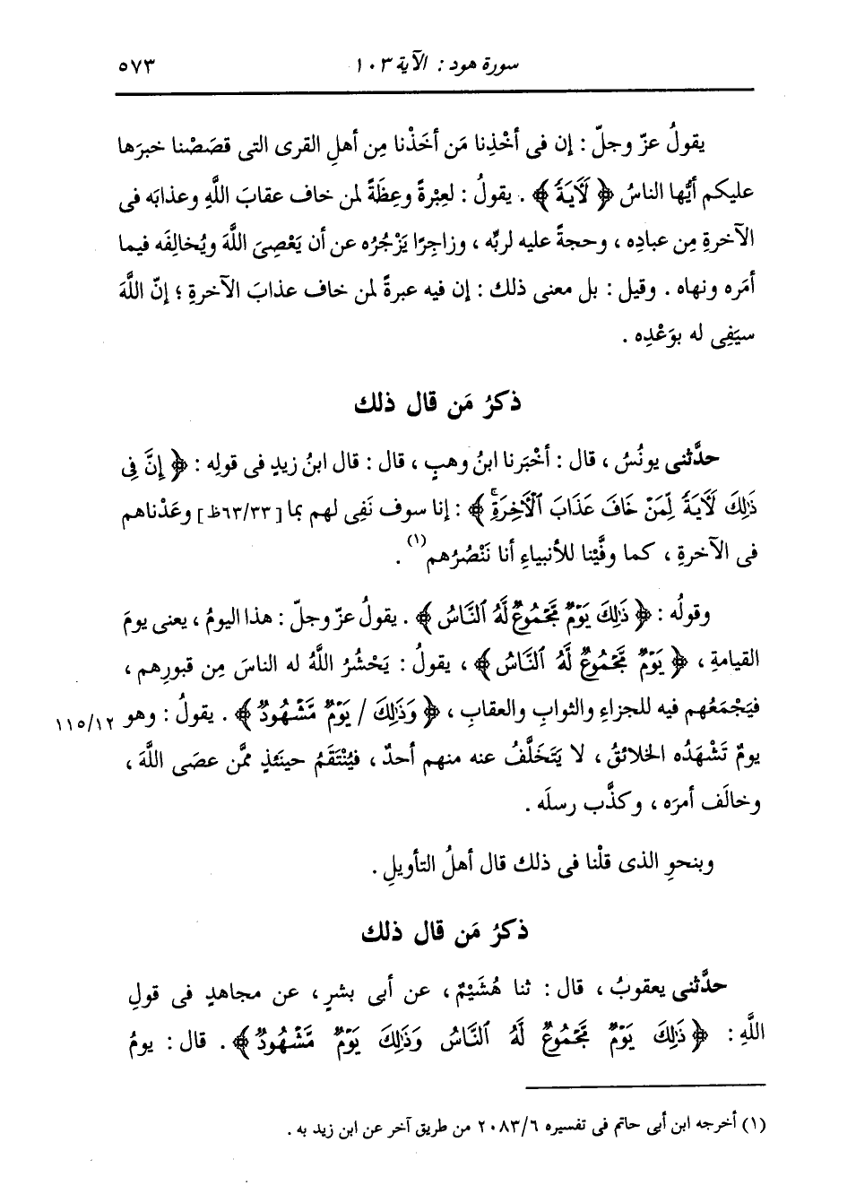 حَدَّثَنِي يَعْقُوبُ، قَالَ: ثَنَا هُشَيْمٌ، عَنْ أَبِي بِشْرٍ، عَنْ مُجَاهِدٍ، فِي قَوْلِهِ: " {§ذَلِكَ يَوْمٌ مَجْمُوعٌ لَهُ النَّاسُ وَذَلِكَ يَوْمٌ مَشْهُودٌ} [هود: 103] قَالَ: يَوْمُ -[574]- الْقِيَامَةِ " حَدَّثَنِي يَعْقُوبُ، قَالَ: ثَنَا هُشَيْمٌ، عَنْ أَبِي بِشْرٍ، عَنْ عِكْرِمَةَ، مِثْلَهُ