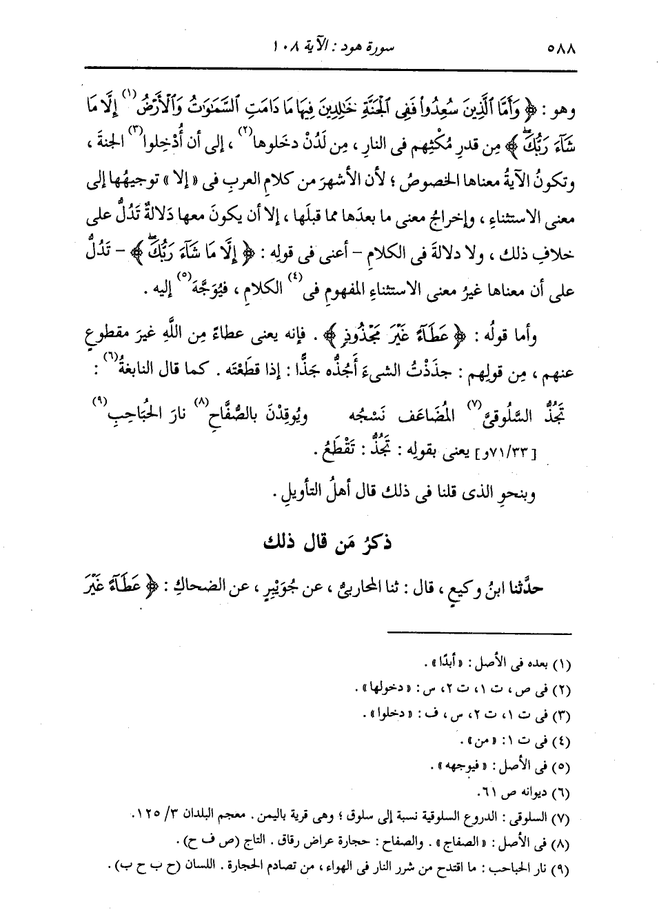 وَهُوَ {وَأَمَّا الَّذِينَ سُعِدُوا فَفِي الْجَنَّةِ خَالِدِينَ فِيهَا مَا دَامَتِ السَّمَوَاتُ وَالْأَرْضُ إِلَّا مَا شَاءَ رَبُّكَ} مِنْ قَدْرِ مُكْثِهِمْ فِي النَّارِ، مِنْ لَدُنْ دَخَلُوهَا إِلَى أَنْ أُدْخِلُوا الْجَنَّةَ، وَتَكُونُ الْآيَةُ مَعْنَاهَا الْخُصُوصُ؛ لِأَنَّ الْأَشْهَرَ مِنْ كَلَامِ الْعَرَبِ فِي «إِلَّا» تَوْجِيهُهَا إِلَى مَعْنَى الِاسْتِثَنَاءِ وَإِخْرَاجِ مَعْنَى مَا بَعْدَهَا مِمَّا قَبْلَهَا إِلَّا أَنْ يَكُونَ مَعَهَا دَلَالَةٌ تَدُلُّ عَلَى خِلَافِ ذَلِكَ، وَلَا دَلَالَةَ فِي الْكَلَامِ، أَعْنِي فِي قَوْلِهِ: {إِلَّا مَا شَاءَ رَبُّكَ} [هود: 107] تَدُلُّ عَلَى أَنَّ مَعْنَاهَا غَيْرُ مَعْنَى الِاسْتِثَنَاءِ الْمَفْهُومِ فِي الْكَلَامِ فَيُوَجَّهُ إِلَيْهِ. وَأَمَّا قَوْلُهُ: {عَطَاءً غَيْرَ مَجْذُوذٍ} [هود: 108] فَإِنَّهُ يَعْنِي عَطَاءً مِنَ اللَّهِ غَيْرَ مَقْطُوعٍ عَنْهُمْ، مِنْ قَوْلِهِمْ: جَذَذْتُ الشَّيْءَ أَجُذُّهُ جَذًّا: إِذَا قَطَعْتُهُ، كَمَا قَالَ النَّابِغَةُ:
