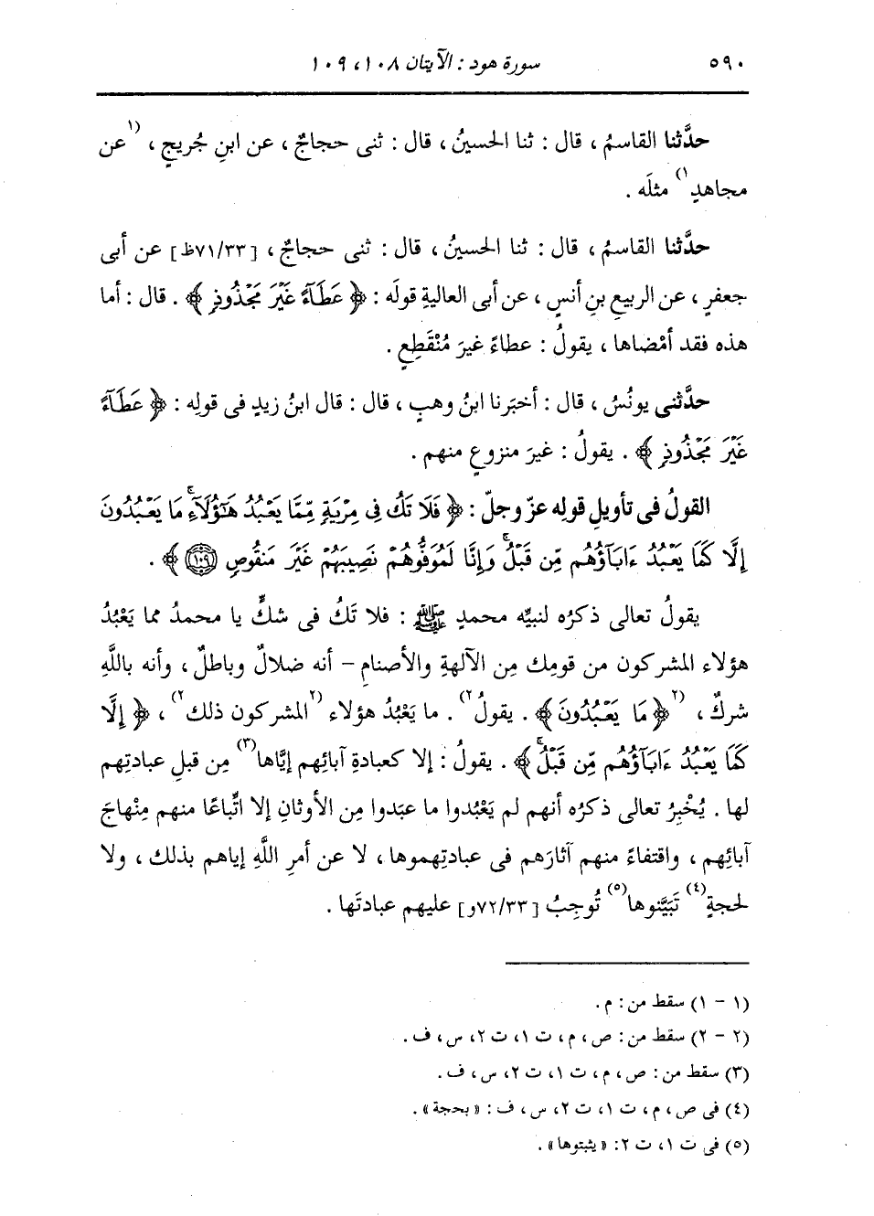§الْقَوْلُ فِي تَأْوِيلِ قَوْلِهِ تَعَالَى: {فَلَا تَكُ فِي مِرْيَةٍ مِمَّا يَعْبُدُ هَؤُلَاءِ مَا يَعْبُدُونَ إِلَّا كَمَا يَعْبُدُ آبَاؤُهُمْ مِنْ قَبْلُ وَإِنَّا لَمُوَفُّوهُمْ نَصِيبَهُمْ غَيْرَ مَنْقُوصٍ} [هود: 109] يَقُولُ تَعَالَى ذِكْرُهُ لِنَبِيِّهِ مُحَمَّدٌ صَلَّى اللهُ عَلَيْهِ وَسَلَّمَ: فَلَا تَكُ فِي شَكٍّ يَا مُحَمَّدُ مِمَّا يَعْبُدُ هَؤُلَاءِ الْمُشْرِكُونَ مِنْ قَوْمِكَ مِنَ الْآلِهَةِ وَالْأَصْنَامِ أَنَّهُ ضَلَالٌ وَبَاطِلٌ، وَأَنَّهُ بِاللَّهِ شِرْكٌ، مَا يَعْبُدُ هَؤُلَاءِ إِلَّا كَمَا يَعْبُدُ آبَاؤُهُمْ مِنْ قَبْلُ، يَقُولُ: إِلَّا كَعِبَادَةِ آبَائِهِمْ مِنْ قَبْلِ عِبَادَتِهِمْ لَهَا. يُخْبِرُ تَعَالَى ذِكْرُهُ أَنَّهُمْ لَمْ يَعْبُدُوا مَا عَبَدُوا مِنَ الْأَوْثَانِ إِلَّا اتِّبَاعًا مِنْهُمْ مِنْهَاجَ آبَائِهِمْ، وَاقْتِفَاءً مِنْهُمْ آثَارَهُمْ فِي عِبَادَتِهِمُوهَا، لَا عَنْ أَمْرِ اللَّهِ إِيَّاهُمْ بِذَلِكَ، وَلَا بِحُجَّةٍ تَبَيَّنُوهَا تُوجِبُ عَلَيْهِمْ عِبَادَتَهَا.