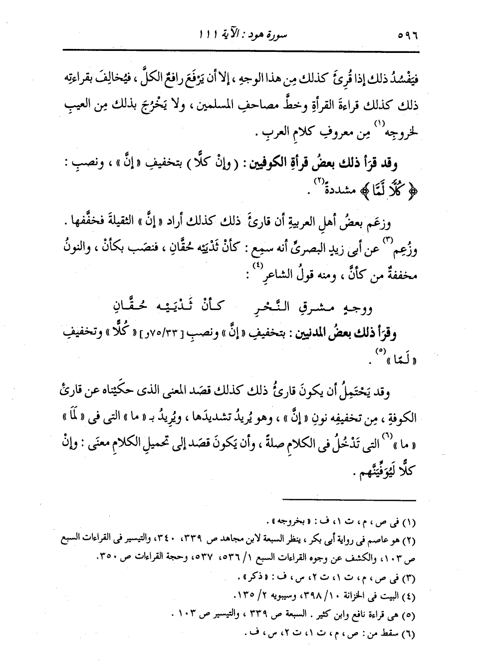 وَقَرَأَ ذَلِكَ بَعْضُ الْمَدَنِيِّينَ بِتَخْفِيفِ «إِنَّ» وَنَصْبِ «كُلًّا» ، وَتَخْفِيفِ «لَمَّا» . وَقَدْ يَحْتَمِلُ أَنْ يَكُونَ قَارِئُ ذَلِكَ كَذَلِكَ قَصَدَ الْمَعْنَى الَّذِي حَكَيْنَاهُ عَنْ قَارِئِ الْكُوفَةِ مِنْ تَخْفِيفِهِ نُونَ «إِنَّ» وَهُوَ يُرِيدُ تَشْدِيدَهَا، وَيُرِيدُ بِمَا الَّتِي فِي «لَمَّا» الَّتِي تَدْخُلُ فِي الْكَلَامِ صِلَةً، وَأَنْ يَكُونَ قَصَدَ إِلَى تَحْمِيلِ الْكَلَامِ مَعْنَى: وَإِنْ كُلًّا لَيُوَفِّيَنَّهُمْ؛
