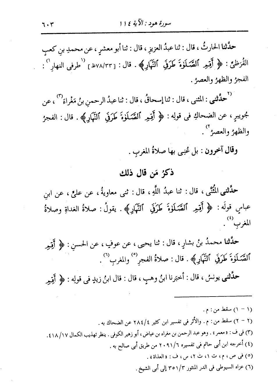 حَدَّثَنِي الْمُثَنَّى، قَالَ: ثَنَا عَبْدُ اللَّهِ، قَالَ: ثَنِي مُعَاوِيَةُ، عَنْ عَلِيٍّ، عَنِ ابْنِ عَبَّاسٍ، فِي قَوْلِهِ: " {§أَقِمِ الصَّلَاةَ طَرَفَيِ النَّهَارِ} [هود: 114] يَقُولُ: صَلَاةُ الْغَدَاةِ وَصَلَاةُ الْمَغْرِبِ "