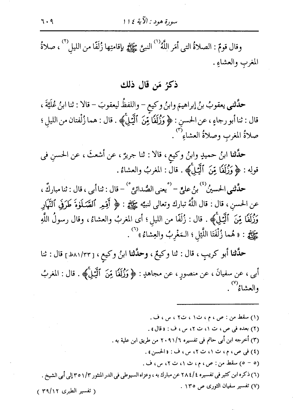 حَدَّثَنَا أَبُو كُرَيْبٍ، قَالَ: ثَنَا وَكِيعٌ، وحَدَّثَنَا ابْنُ وَكِيعٍ، قَالَ: ثَنَا أَبِي، عَنْ سُفْيَانَ عَنْ مَنْصُورٍ عَنْ مُجَاهِدٍ " {§وَزُلَفًا مِنَ اللَّيْلِ} [هود: 114] قَالَ: الْمَغْرِبُ وَالْعِشَاءُ " -[610]- حَدَّثَنَا الْحَسَنُ بْنُ يَحْيَى، قَالَ: أَخْبَرَنَا عَبْدُ الرَّزَّاقِ، قَالَ: أَخْبَرَنَا الثَّوْرِيُّ، عَنْ مَنْصُورٍ، عَنْ مُجَاهِدٍ، مِثْلَهُ. حَدَّثَنِي الْمُثَنَّى، قَالَ: ثَنَا أَبُو نُعَيْمٍ، قَالَ: ثَنَا سُفْيَانُ، عَنْ مَنْصُورٍ، عَنْ مُجَاهِدٍ، مِثْلَهُ