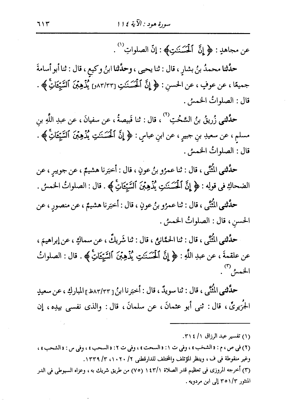 حَدَّثَنِي الْمُثَنَّى، قَالَ: ثَنَا الْحِمَّانِيُّ، قَالَ: ثَنَا شَرِيكٌ، عَنْ سِمَاكٍ، عَنْ إِبْرَاهِيمَ، عَنْ عَلْقَمَةَ، عَنْ عَبْدِ اللَّهِ، " {§إِنَّ الْحَسَنَاتِ يُذْهِبْنَ السَّيِّئَاتِ} [هود: 114] قَالَ: الصَّلَوَاتُ الْخَمْسُ "