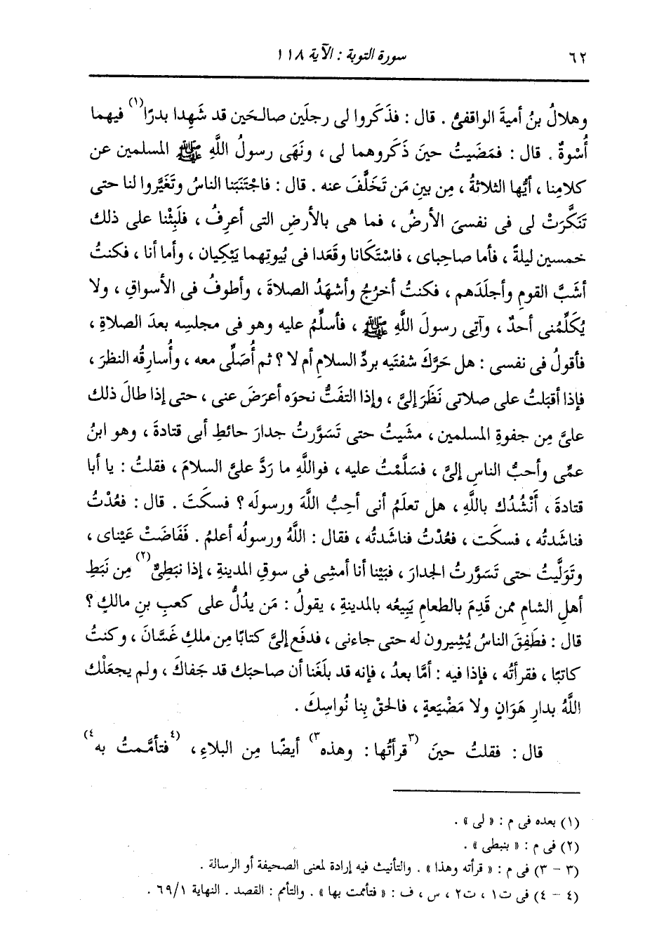 وَهِلَالُ بْنُ أُمَيَّةَ الْوَاقِفِيُّ. قَالَ: فَذَكَرُوا لِي رَجُلَيْنِ صَالِحَيْنِ قَدْ شَهِدَا بَدْرًا فِيهِمَا أُسْوَةٌ. قَالَ: فَمَضَيْتُ حِينَ ذَكَرُوهُمَا لِي. وَنَهَى رَسُولُ اللَّهِ صَلَّى اللهُ عَلَيْهِ وَسَلَّمَ الْمُسْلِمِينَ عَنْ كَلَامِنَا أَيُّهَا الثَّلَاثَةُ مِنْ بَيْنِ مِنْ تَخَلَّفَ عَنْهُ، قَالَ: فَاجْتَنَبَنَا النَّاسُ وَتَغَيَّرُوا لَنَا حَتَّى تَنَكَّرَتْ لِي فِي نَفْسِي الْأَرْضُ فَمَا هِيَ بِالْأَرْضِ الَّتِي أَعْرِفُ، فَلَبِثْنَا عَلَى ذَلِكَ خَمْسِينَ لَيْلَةً. فَأَمَّا صَاحِبَايَ فَاسْتَكَانَا وَقَعَدَا فِي بُيُوتِهِمَا يَبْكِيَانِ، وَأَمَّا أَنَا فَكُنْتُ أَشَبُّ الْقَوْمَ وَأَجْلَدُهُمْ، فَكُنْتُ أَخْرُجُ وَأَشْهَدُ الصَّلَاةَ وَأَطُوفُ فِي الْأَسْوَاقِ وَلَا يُكَلِّمُنِي أَحَدٌ، وَآتِي رَسُولَ اللَّهِ صَلَّى اللهُ عَلَيْهِ وَسَلَّمَ فَأُسَلِّمُ عَلَيْهِ وَهُوَ فِي مَجْلِسِهِ بَعْدَ الصَّلَاةِ، فَأَقُولُ فِي نَفْسِي هَلْ حَرَّكَ شَفَتَيْهِ يَرُدُّ السَّلَامَ أَمْ لَا؟ ثُمَّ أُصَلِّي مَعَهُ وَأُسَارِقُهُ النَّظَرَ، فَإِذَا أَقْبَلَتُ عَلَى صَلَاتِي نَظَرَ إِلَيَّ وَإِذَا الْتَفَتُ نَحْوَهُ أَعْرَضَ عَنِّي. حَتَّى إِذَا طَالَ ذَلِكَ عَلَيَّ مِنْ جَفْوَةِ الْمُسْلِمِينَ، مَشَيْتُ حَتَّى تَسَوَّرْتُ جِدَارَ حَائِطِ أَبِي قَتَادَةَ وَهُوَ ابْنُ عَمِّي وَأَحَبُّ النَّاسَ إِلَيَّ، فَسَلَّمْتُ عَلَيْهِ، فَوَاللَّهِ مَا رَدَّ عَلَيَّ السَّلَامَ، فَقُلْتُ: يَا أَبَا قَتَادَةَ أَنْشُدُكَ بِاللَّهِ هَلْ تَعْلَمُ أَنِّي أُحِبُّ اللَّهَ وَرَسُولَهُ؟ فَسَكَتَ، قَالَ: فَعُدْتُ فَنَاشَدْتُهُ فَسَكَتَ، فَعُدْتُ فَنَاشَدْتُهُ فَقَالَ: اللَّهُ وَرَسُولُهُ أَعْلَمُ فَفَاضَتْ عَيْنَايَ، وَتَوَلَّيْتُ حَتَّى تَسَوَّرْتُ الْجِدَارَ. فَبَيْنَا أَنَا أَمْشِي فِي سُوقِ الْمَدِينَةِ، إِذَا بِنِبْطِيٍّ مِنْ نَبَطِ أَهْلِ الشَّامِ مِمَّنْ قَدِمَ بِالطَّعَامِ يَبِيعُهُ بِالْمَدِينَةِ، يَقُولُ: مَنْ يَدُلُّ عَلَى كَعْبِ بْنِ مَالِكٍ؟ قَالَ: فَطَفِقَ النَّاسُ يُشِيرُونَ لَهُ حَتَّى جَاءَنِي، فَدَفَعَ إِلَيَّ كِتَابًا مِنْ مَلَكِ غَسَّانَ، وَكُنْتُ كَاتِبًا، فَقَرَأْتُهُ فَإِذَا فِيهِ: أَمَا بَعْدُ فَإِنَّهُ قَدْ بَلَغَنَا أَنَّ صَاحِبَكَ قَدْ جَفَاكَ، وَلَمْ يَجْعَلْكَ اللَّهُ بِدَارِ هَوَانٍ وَلَا مَضْيَعَةٍ، فَالْحَقْ بِنَا نُوَاسِكَ قَالَ: فَقُلْتُ حِينَ قَرَأْتُهُ: وَهَذَا أَيْضًا مِنَ الْبَلَاءِ. فَتَأَمَّمْتُ بِهِ