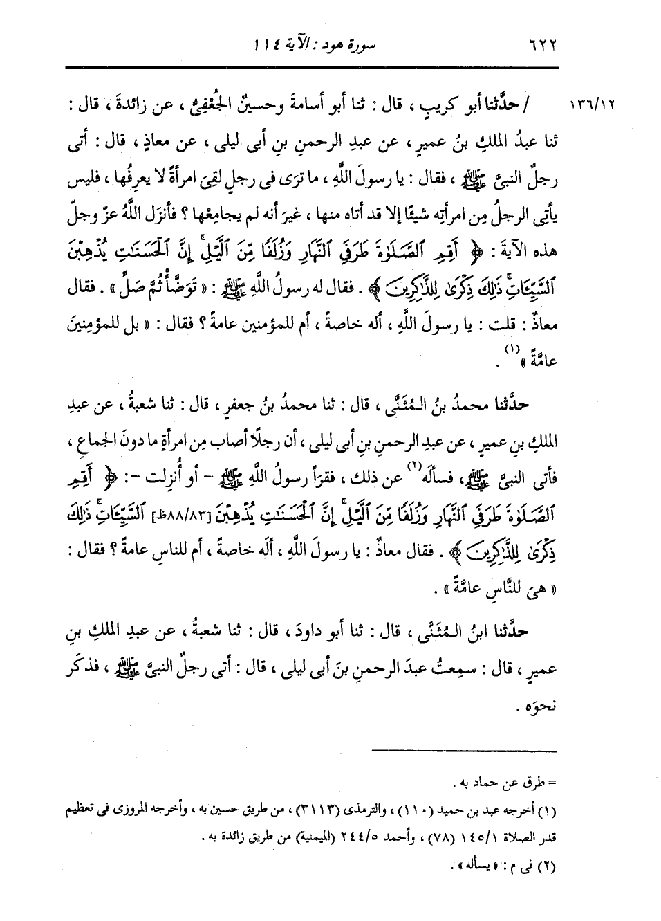حَدَّثَنَا أَبُو كُرَيْبٍ، قَالَ: ثَنَا أَبُو أُسَامَةَ، وَحُسَيْنُ الْجُعْفِيُّ، عَنْ زَائِدَةَ، قَالَ: ثَنَا عَبْدُ الْمَلِكِ بْنُ عُمَيْرٍ، عَنْ عَبْدِ الرَّحْمَنِ بْنِ أَبِي لَيْلَى، عَنْ مُعَاذٍ، قَالَ: " أَتَى رَجُلٌ النَّبِيَّ صَلَّى اللهُ عَلَيْهِ وَسَلَّمَ فَقَالَ: يَا رَسُولَ اللَّهِ §مَا تَرَى فِي رَجُلٍ لَقِيَ امْرَأَةً لَا يَعْرِفُهَا، فَلَيْسَ يَأْتِي الرَّجُلُ مِنِ امْرَأَتِهِ شَيْئًا إِلَّا قَدْ أَتَاهُ مِنْهَا غَيْرَ أَنَّهُ لَمْ يُجَامِعْهَا؟ فَأَنْزَلَ اللَّهُ هَذِهِ الْآيَةَ: {أَقِمِ الصَّلَاةَ طَرَفَيِ النَّهَارِ وَزُلَفًا مِنَ اللَّيْلِ إِنَّ الْحَسَنَاتِ يُذْهِبْنَ السَّيِّئَاتِ ذَلِكَ ذِكْرَى لِلذَّاكِرِينَ} [هود: 114] فَقَالَ لَهُ رَسُولُ اللَّهِ صَلَّى اللهُ عَلَيْهِ وَسَلَّمَ: «تَوَضَّأَ ثُمَّ صَلِّ» قَالَ مُعَاذٌ: قُلْتُ يَا رَسُولَ اللَّهِ، أَلَهُ خَاصَّةً أَمْ لِلْمُؤْمِنينَ عَامَّةً؟ قَالَ: «بَلْ لِلْمُؤْمِنِينَ عَامَّةً»