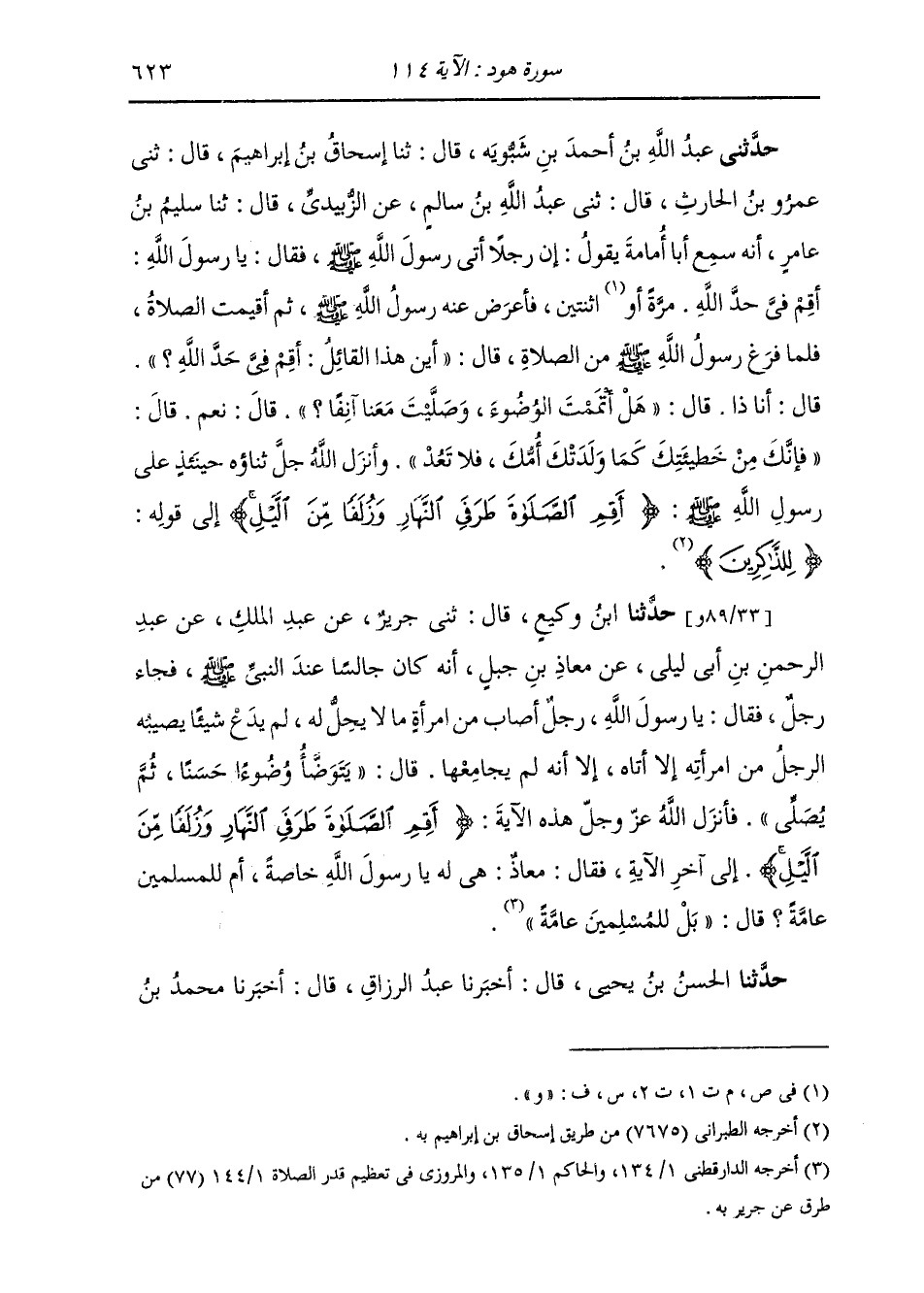 حَدَّثَنَا ابْنُ وَكِيعٍ، قَالَ: ثَنِي جَرِيرٌ، عَنْ عَبْدِ الْمَلِكِ، عَنْ عَبْدِ الرَّحْمَنِ بْنِ أَبِي لَيْلَى، عَنْ مُعَاذِ بْنِ جَبَلِ: أَنَّهُ كَانَ جَالِسًا عِنْدَ النَّبِيِّ صَلَّى اللهُ عَلَيْهِ وَسَلَّمَ، فَجَاءَ رَجُلٌ، فَقَالَ: يَا رَسُولَ اللَّهِ، §رَجُلٌ أَصَابَ مِنِ امْرَأَةٍ مَا لَا يَحِلُّ لَهُ، لَمْ يَدَعْ شَيْئًا يُصِيبُهُ الرَّجُلُ مِنِ امْرَأَتِهِ إِلَّا أَتَاهُ إِلَّا أَنَّهُ لَمْ يُجَامِعْهَا؟ قَالَ: «يَتَوَضَّأُ وضُوءًا حَسَنًا ثُمَّ يُصَلِّي» فَأَنْزَلَ اللَّهُ هَذِهِ الْآيَةَ: {أَقِمِ الصَّلَاةَ طَرَفَيِ النَّهَارِ وَزُلَفًا مِنَ اللَّيْلِ} [هود: 114] الْآيَةَ، فَقَالَ مُعَاذٌ: هِيَ لَهُ يَا رَسُولَ اللَّهِ خَاصَّةً، أَمْ لِلْمُسْلِمِينَ عَامَّةً؟ قَالَ: «بَلْ لِلْمُسْلِمِينَ عَامَّةً»
