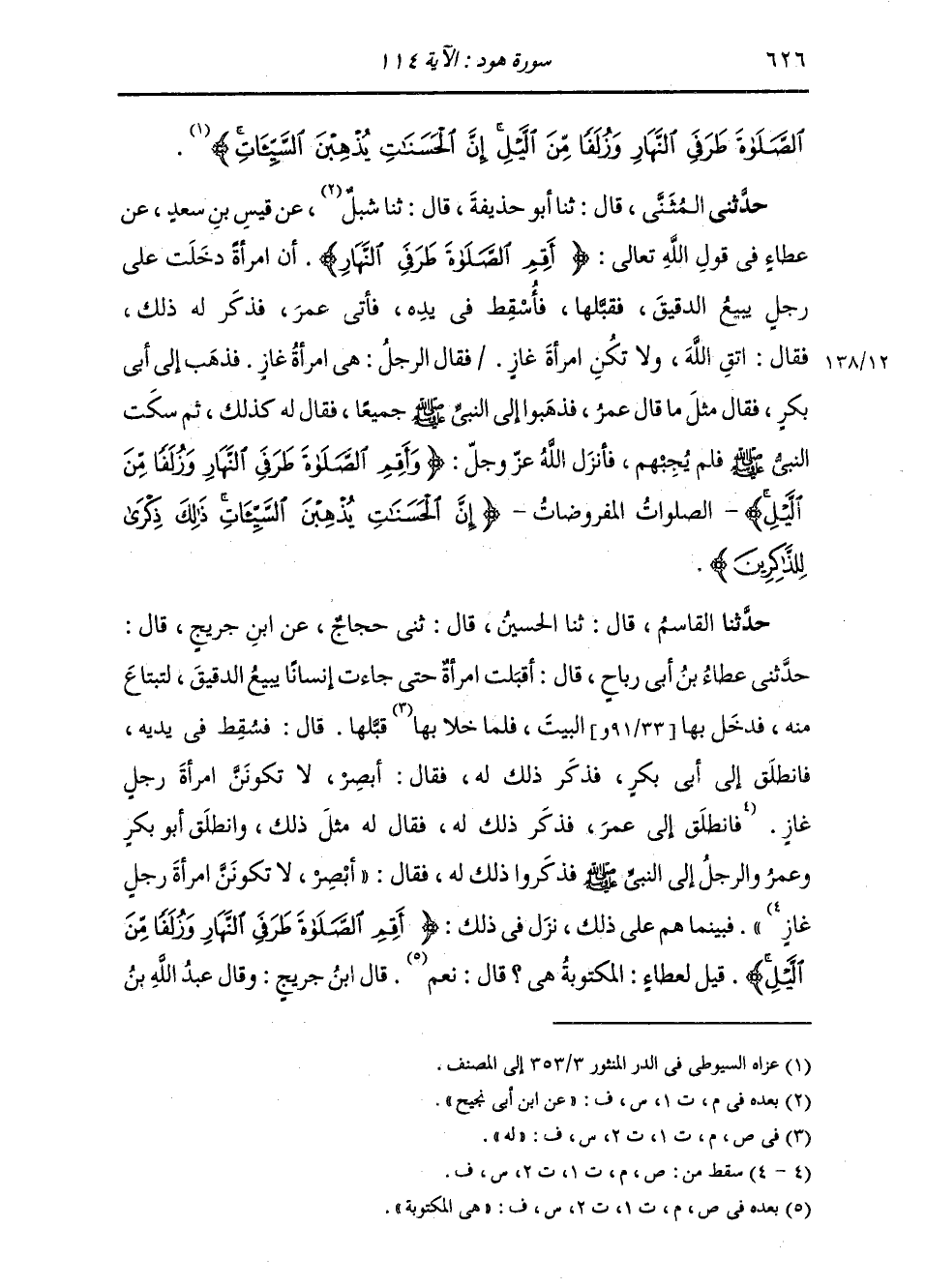 حَدَّثَنِي الْمُثَنَّى، قَالَ: ثَنَا أَبُو حُذَيْفَةَ، قَالَ: ثَنَا شِبْلٌ، عَنِ ابْنِ أَبِي نَجِيحٍ، عَنْ قَيْسِ بْنِ سَعْدٍ، عَنْ عَطَاءٍ " فِي قَوْلِ اللَّهِ تَعَالَى: {§أَقِمْ الصَّلَاةَ طَرَفَيِ النَّهَارِ وَزُلَفًا مِنَ اللَّيْلِ} [هود: 114] أَنَّ امْرَأَةً دَخَلَتْ عَلَى رَجُلٍ يَبِيعُ الدَّقِيقَ، فَقَبَّلَهَا فَأُسْقِطَ فِي يَدِهِ. فَأَتَى عُمَرَ فَذَكَرَ ذَلِكَ لَهُ، فَقَالَ: اتَّقِ اللَّهَ وَلَا تَكُنِ امْرَأَةُ غَازٍ فَقَالَ الرَّجُلُ: هِيَ امْرَأَةُ غَازٍ. فَذَهَبَ إِلَى أَبِي بَكْرٍ فَقَالَ مِثْلَ مَا قَالَ عُمَرُ. فَذَهَبُوا إِلَى النَّبِيِّ صَلَّى اللهُ عَلَيْهِ وَسَلَّمَ جَمِيعًا، فَقَالَ لَهُ: كَذَلِكَ، ثُمَّ سَكَتَ النَّبِيُّ صَلَّى اللهُ عَلَيْهِ وَسَلَّمَ، فَلَمْ يُجِبْهُمْ، فَأَنْزَلَ اللَّهُ: {أَقِمِ الصَّلَاةَ طَرَفَيِ النَّهَارِ وَزُلَفًا مِنَ اللَّيْلِ} [هود: 114] الصَّلَوَاتِ الْمَفْرُوضَاتِ {إِنَّ الْحَسَنَاتِ يُذْهِبْنَ السَّيِّئَاتِ ذَلِكَ ذِكْرَى لِلذَّاكِرِينَ} [هود: 114] "