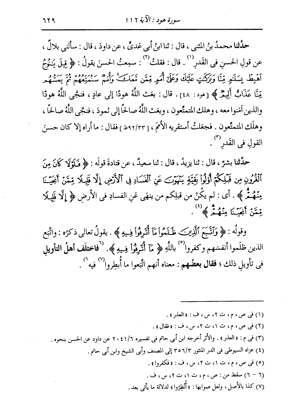 حَدَّثَنَا بِشْرٌ، قَالَ: ثَنَا يَزِيدُ، قَالَ: ثَنَا سَعِيدٌ، عَنْ قَتَادَةَ " {§فَلَوْلَا كَانَ مِنَ الْقُرُونِ مِنْ قَبْلِكُمْ أُولُو بَقِيَّةٍ يَنْهَوْنَ عَنِ الْفَسَادِ فِي الْأَرْضِ إِلَّا قَلِيلًا مِمَّنْ أَنْجَيْنَا مِنْهُمْ} أَيْ لَمْ يَكُنْ مِنْ قَبْلِكُمْ مَنْ يَنْهَى عَنِ الْفَسَادِ فِي الْأَرْضِ، {إِلَّا قَلِيلًا مِمَّنْ أَنْجَيْنَا مِنْهُمْ} [هود: 116] "
