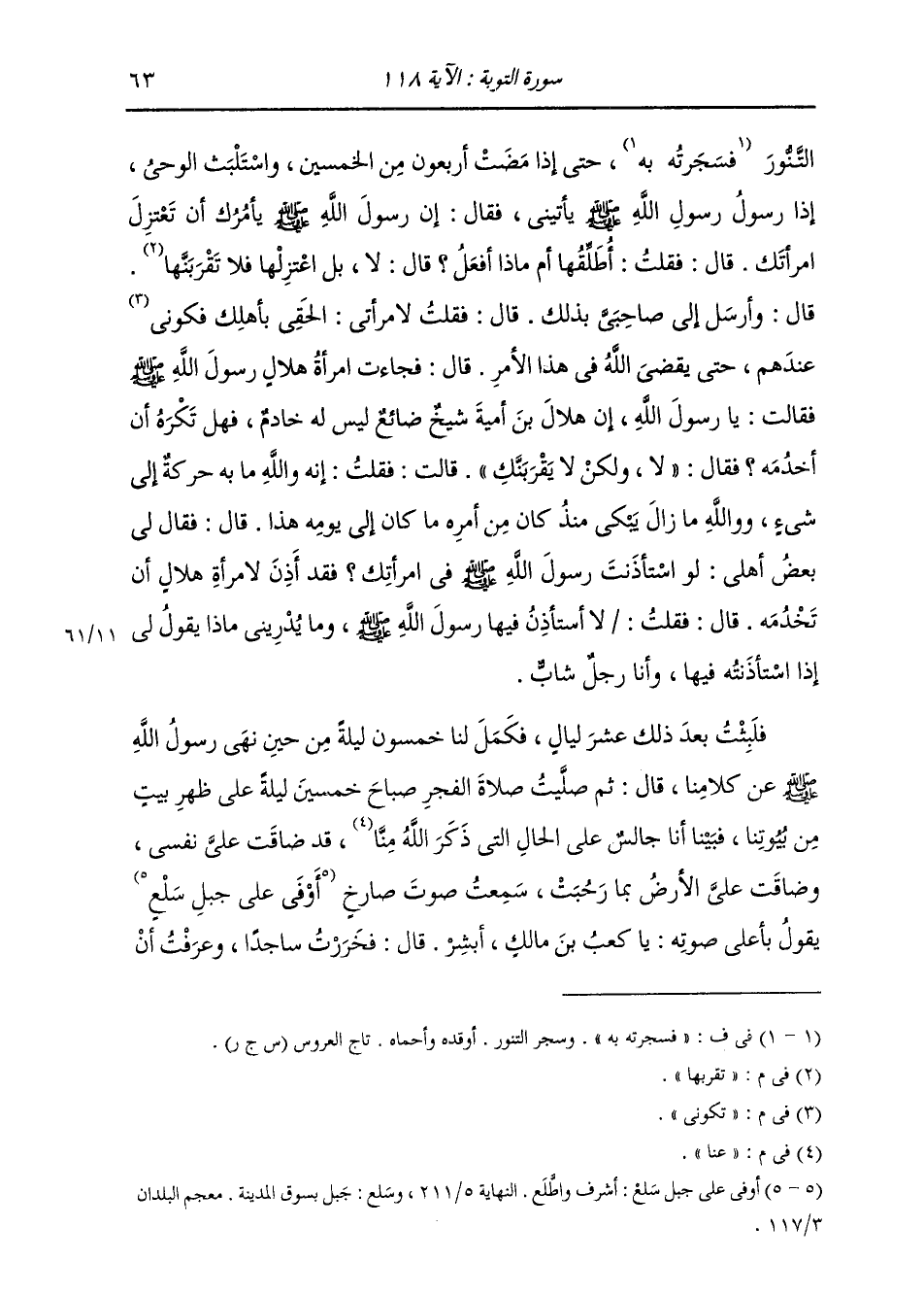 التَّنُّورَ فَسَجَرْتُهُ بِهِ. حَتَّى إِذَا مَضَتْ أَرْبَعُونَ مِنَ الْخَمْسِينَ وَاسْتَلْبَثَ الْوَحْي إِذَا رَسُولُ رَسُولِ اللَّهِ صَلَّى اللهُ عَلَيْهِ وَسَلَّمَ يَأْتِينِي فَقَالَ: إِنَّ رَسُولَ اللَّهِ صَلَّى اللهُ عَلَيْهِ وَسَلَّمَ يَأْمُرُكَ أَنْ تَعْتَزِلَ امْرَأَتَكَ، قَالَ: فَقُلْتُ: أُطَلِّقُهَا أَمْ مَاذَا أَفْعَلُ؟ قَالَ: لَا بَلْ اعْتَزِلْهَا فَلَا تَقْرَبْهَا قَالَ: وَأَرْسَلَ إِلَى صَاحِبَيِّ بِذَلِكَ، قَالَ: فَقُلْتُ لِامْرَأَتِي: الْحِقِي بِأَهْلِكِ تَكُونِي عِنْدَهُمْ حَتَّى يَقْضِي اللَّهُ فِي هَذَا الْأَمْرِ قَالَ: فَجَاءَتِ امْرَأَةُ هِلَالِ رَسُولَ اللَّهِ صَلَّى اللهُ عَلَيْهِ وَسَلَّمَ فَقَالَتْ: يَا رَسُولَ اللَّهِ إِنَّ هِلَالَ بْنَ أُمَيَّةَ شَيْخٌ ضَائِعٌ لَيْسَ لَهُ خَادِمٌ، فَهَلْ تَكْرَهُ أَنْ أَخْدُمَهُ؟ فَقَالَ: «لَا، وَلَكِنْ لَا يَقْرَبَنَّكِ» قَالَتْ: فَقُلْتُ: إِنَّهُ وَاللَّهِ مَا بِهِ حَرَكَةٌ إِلَى شَيْءٍ، وَوَاللهِ مَا زَالَ يَبْكِي مُنْذُ كَانَ مِنْ أَمْرِهِ مَا كَانَ إِلَى يَوْمِهِ هَذَا قَالَ: فَقَالَ لِي بَعْضُ أَهْلِي: لَوْ اسْتَأْذَنْتَ رَسُولَ اللَّهِ صَلَّى اللهُ عَلَيْهِ وَسَلَّمَ فِي امْرَأَتِكَ فَقَدْ أَذِنَ لِامْرَأَةِ هِلَالِ أَنْ تَخْدُمَهُ قَالَ: فَقُلْتُ لَا أَسْتَأْذِنُ فِيهَا رَسُولَ اللَّهِ صَلَّى اللهُ عَلَيْهِ وَسَلَّمَ، وَمَا يُدْرِينِي مَاذَا يَقُولُ لِي إِذَا اسْتَأْذَنْتُهُ فِيهَا وَأَنَا رَجُلٌ شَابٌّ. فَلَبِثْتُ بَعْدَ ذَلِكَ عَشَرَ لَيَالٍ، فَكَمَلَ لَنَا خَمْسُونَ لَيْلَةً مِنْ حِينِ نَهَى رَسُولُ اللَّهِ صَلَّى اللهُ عَلَيْهِ وَسَلَّمَ عَنْ كَلَامِنَا. قَالَ: ثُمَّ صَلَّيْتُ صَلَاةَ الْفَجْرِ صَبَاحَ خَمْسِينَ لَيْلَةً عَلَى ظَهْرِ بَيْتٍ مِنْ بُيُوتِنَا، فَبَيْنَا أَنَا جَالِسٌ عَلَى الْحَالِ الَّتِي ذَكَرَ اللَّهُ عَنَّا قَدْ ضَاقَتْ عَلَيَّ نَفْسِي وَضَاقَتْ عَلَيَّ الْأَرْضُ بِمَا رَحُبَتْ، سَمِعْتُ صَوْتَ صَارِخٍ أَوْفَى عَلَى جَبَلِ سَلْعٍ يَقُولُ بِأَعْلَى صَوْتِهِ: يَا كَعْبُ بْنُ مَالِكٍ أَبْشِرْ قَالَ: فَخَرَرْتُ سَاجِدًا، وَعَرَفْتُ أَنْ