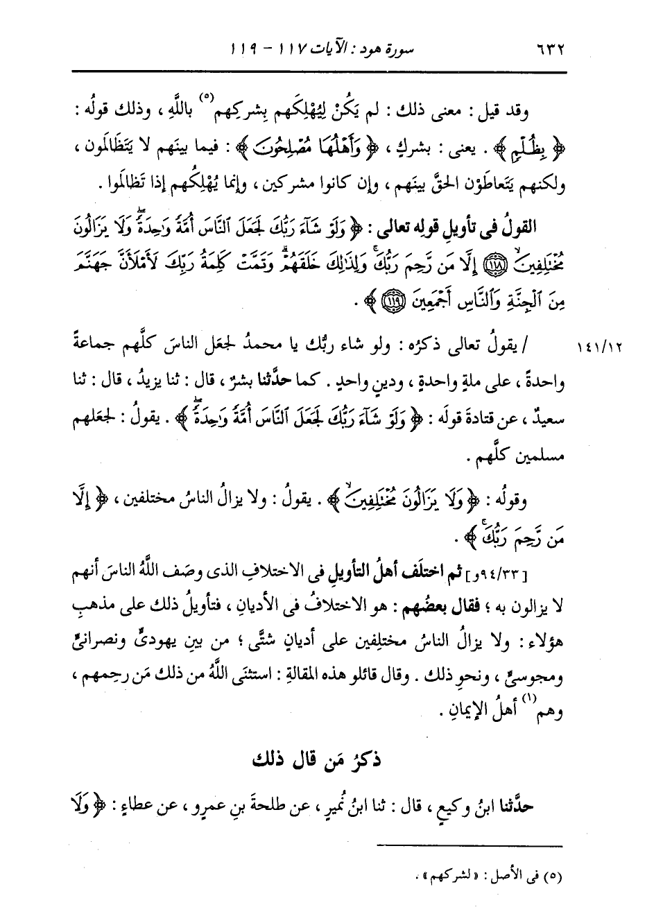 §وَقَوْلُهُ: {وَلَا يَزَالُونَ مُخْتَلِفِينَ} [هود: 118] يَقُولُ تَعَالَى ذِكْرُهُ: وَلَا يَزَالُ النَّاسُ مُخْتَلِفِينَ، {إِلَّا مَنْ رَحِمَ رَبُّكَ} [هود: 119] ثُمَّ اخْتَلَفَ أَهْلُ التَّأْوِيلِ فِي الِاخْتِلَافِ الَّذِي وَصَفَ اللَّهُ النَّاسَ أَنَّهُمْ لَا يَزَالُونَ بِهِ، فَقَالَ بَعْضُهُمْ: هُوَ الِاخْتِلَافُ فِي الْأَدْيَانِ. فَتَأْوِيلُ ذَلِكَ عَلَى مَذْهَبِ هَؤُلَاءِ وَلَا يَزَالُ النَّاسُ مُخْتَلِفِينَ عَلَى أَدْيَانٍ شَتَّى مِنْ بَيْنِ يَهُودِيٍّ وَنَصْرَانِيٍّ وَمَجُوسِيٍّ، وَنَحْوِ ذَلِكَ. وَقَالَ قَائِلُو هَذِهِ الْمَقَالَةِ: اسْتَثْنَى اللَّهُ مِنْ ذَلِكَ مَنْ رَحِمَهُمْ، وَهُمْ أَهْلُ الْإِيمَانِ ذِكْرُ مَنْ قَالَ ذَلِكَ: