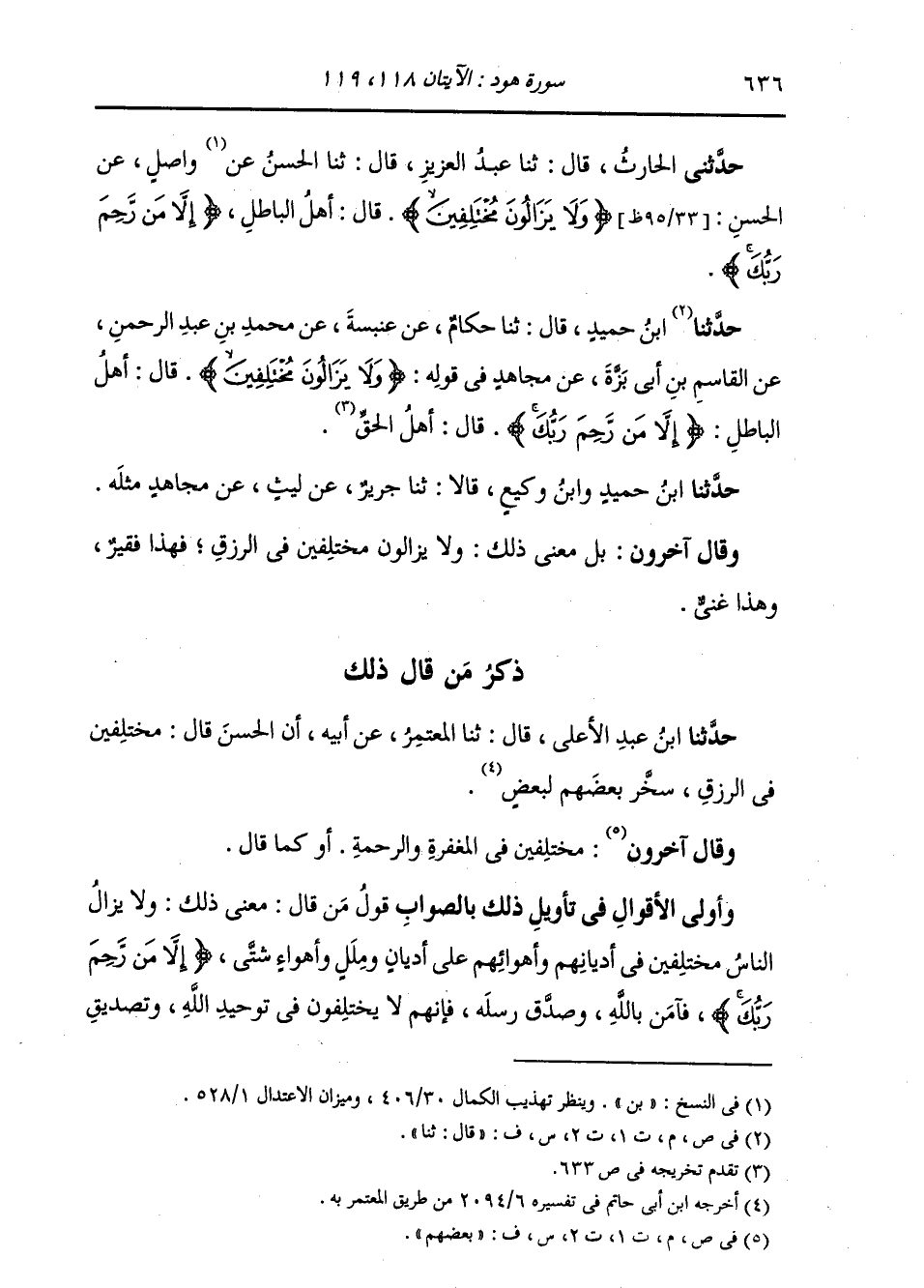 قَالَ: ثَنَا عَبْدُ الْعَزِيزِ، قَالَ: ثَنَا الْحَسَنُ بْنُ وَاصِلٍ، عَنِ الْحَسَنِ، " {§وَلَا يَزَالُونَ مُخْتَلِفِينَ} [هود: 118] قَالَ: أَهْلُ الْبَاطِلِ {إِلَّا مَنْ رَحِمَ رَبُّكَ} [هود: 119] "