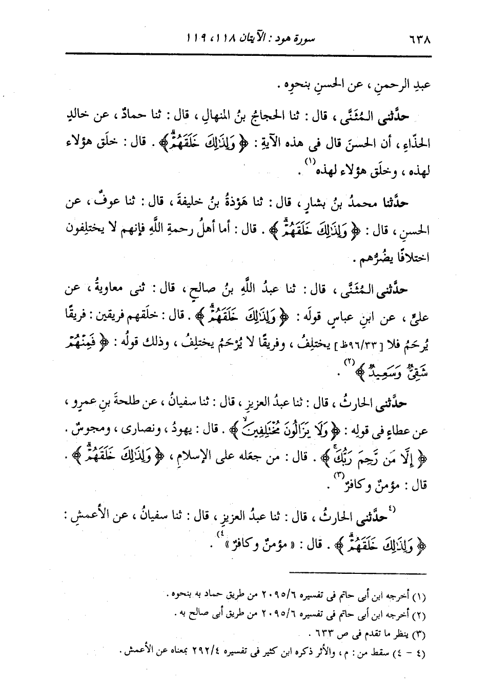 حَدَّثَنِي الْمُثَنَّى، قَالَ: ثَنَا عَبْدُ اللَّهِ بْنُ صَالِحٍ، قَالَ: ثَنِي مُعَاوِيَةُ، عَنْ عَلِيٍّ، عَنِ ابْنِ عَبَّاسٍ، قَوْلُهُ: " {§وَلِذَلِكَ خَلَقَهُمْ} [هود: 119] قَالَ: خَلَقَهُمْ فَرِيقَيْنِ: فَرِيقًا يَرْحَمُ، فَلَا يَخْتَلِفُ، وَفَرِيقًا لَا يُرْحَمُ يَخْتَلِفُ، وَذَلِكَ قَوْلُهُ: {فَمِنْهُمْ شَقِيُّ وَسَعِيدٌ} [هود: 105] "