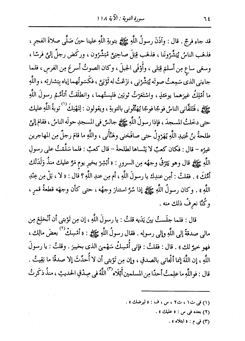 قَدْ جَاءَ فَرَجٌ. قَالَ: وَأَذِنَ رَسُولُ اللَّهِ صَلَّى اللهُ عَلَيْهِ وَسَلَّمَ بِتَوْبَةِ اللَّهِ عَلَيْنَا حِينَ صَلَّى صَلَاةَ الْفَجْرِ، فَذَهَبَ النَّاسُ يُبَشِّرُونَنَا، فَذَهَبَ قِبَلَ صَاحِبَيِّ مُبَشِّرُونَ، وَرَكَضَ رَجُلٌ إِلَيَّ فَرَسًا، وَسَعَى سَاعٍ مِنْ أَسْلَمَ قِبَلِي وَأَوْفَى الْجَبَلَ، وَكَانَ الصَّوْتُ أَسْرَعُ مِنَ الْفَرَسِ. فَلَمَّا جَاءَنِي الَّذِي سَمِعْتُ صَوْتَهُ يُبَشِّرُنِي نَزَعْتُ لَهُ ثَوْبِيَّ، فَكَسَوْتُهُمَا إِيَّاهُ بِبِشَارَتِهِ، وَاللَّهِ مَا أَمْلِكُ غَيْرَهُمَا يَوْمَئِذٍ، وَاسْتَعَرْتُ ثَوْبَيْنِ فَلَبِسْتُهُمَا. وَانْطَلَقْتُ أَتَأَمَّمُ رَسُولَ اللَّهِ صَلَّى اللهُ عَلَيْهِ وَسَلَّمَ، فَتَلَقَّانِي النَّاسُ فَوْجًا فَوْجًا يُهَنِّئُونِي بِالتَّوْبَةِ، وَيَقُولُونَ: لِتَهْنِكَ تَوْبَةُ اللَّهِ عَلَيْكَ حَتَّى دَخَلْتُ الْمَسْجِدَ، فَإِذَا رَسُولُ اللَّهِ صَلَّى اللهُ عَلَيْهِ وَسَلَّمَ جَالِسٌ فِي الْمَسْجِدِ حَوْلَهُ النَّاسُ، فَقَامَ إِلَيَّ طَلْحَةُ بْنُ عُبَيْدِ اللَّهِ يُهَرْوِلُ حَتَّى صَافَحَنِي وَهَنَّأَنِي، وَاللَّهِ مَا قَامَ رَجُلٌ مِنَ الْمُهَاجِرِينَ غَيْرُهُ - قَالَ: فَكَانَ كَعْبٌ لَا يَنْسَاهَا لِطَلْحَةَ - قَالَ كَعْبٌ: فَلَمَّا سَلَّمْتُ عَلَى رَسُولِ اللَّهِ صَلَّى اللهُ عَلَيْهِ وَسَلَّمَ قَالَ وَهُوَ يَبْرُقُ وَجْهُهُ مِنَ السُّرُورِ: «أَبْشِرْ بِخَيْرِ يَوْمٍ مَرَّ عَلَيْكَ مُنْذُ وَلَدَتْكَ أُمُّكَ» فَقُلْتُ: أَمِنْ عِنْدِكَ يَا رَسُولَ اللَّهِ، أَمْ مِنْ عِنْدِ اللَّهِ؟ قَالَ: «لَا بَلْ مِنْ عِنْدِ اللَّهِ» . وَكَانَ رَسُولُ اللَّهِ صَلَّى اللهُ عَلَيْهِ وَسَلَّمَ إِذَا سِرَّ اسْتَنَارَ وَجْهُهُ حَتَّى كَأَنَّ وَجْهَهُ قِطْعَةُ قَمَرٍ، وَكُنَّا نَعْرِفُ ذَلِكَ مِنْهُ. قَالَ: فَلَمَّا جَلَسْتُ بَيْنَ يَدَيْهِ قُلْتُ: يَا رَسُولَ اللَّهِ إِنَّ مِنْ تَوْبَتِي أَنْ أَنْخَلِعَ مِنْ مَالِي صَدَقَةً إِلَى اللَّهِ وَإِلَى رَسُولِهِ فَقَالَ رَسُولُ اللَّهِ صَلَّى اللهُ عَلَيْهِ وَسَلَّمَ «أَمْسِكْ بَعْضَ مَالِكَ فَهُوَ خَيْرٌ لَكَ» قَالَ: فَقُلْتُ: فَإِنِّي أَمْسِكُ سَهْمِي الَّذِي بِخَيْبَرَ. وَقُلْتُ: يَا رَسُولَ اللَّهِ إِنَّ اللَّهَ إِنَّمَا أَنْجَانِي بِالصِّدْقِ، وَإِنَّ مِنْ تَوْبَتِي أَنْ لَا أُحَدِّثَ إِلَّا صِدْقًا مَا بَقِيَتُ قَالَ: فَوَاللَّهِ مَا عَلِمْتُ أَحَدًا مِنَ الْمُسْلِمِينَ ابْتَلَاهُ اللَّهُ فِي صِدْقِ الْحَدِيثِ مُنْذُ ذَكَرْتُ