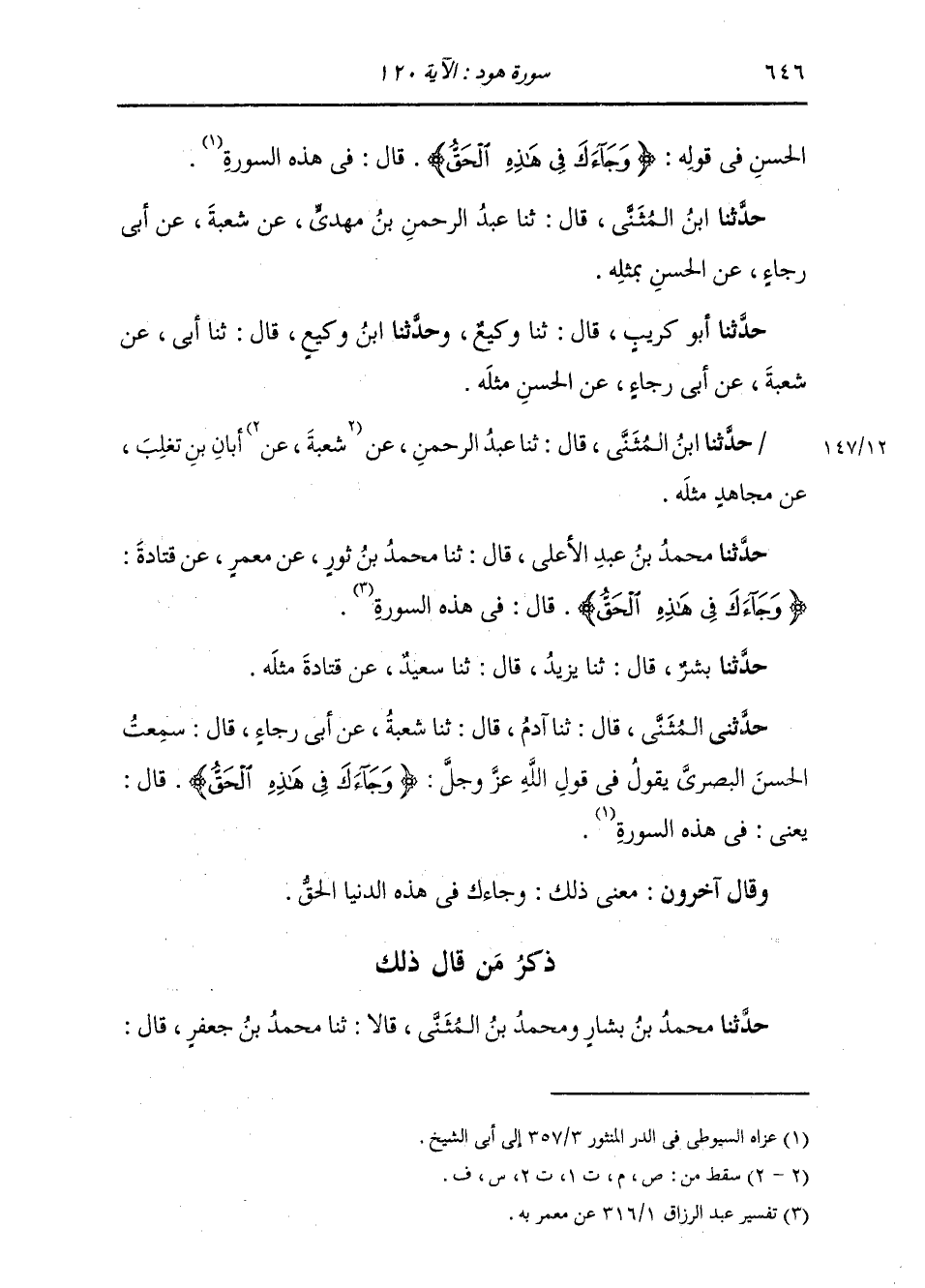 حَدَّثَنَا مُحَمَّدُ بْنُ بَشَّارٍ، وَمُحَمَّدُ بْنُ الْمُثَنَّى، قَالَا: ثَنَا مُحَمَّدُ بْنُ جَعْفَرٍ، قَالَ: -[647]- ثَنَا شُعْبَةُ، عَنْ قَتَادَةَ، " {§وَجَاءَكَ فِي هَذِهِ الْحَقُّ} [هود: 120] قَالَ: فِي هَذِهِ الدُّنْيَا "