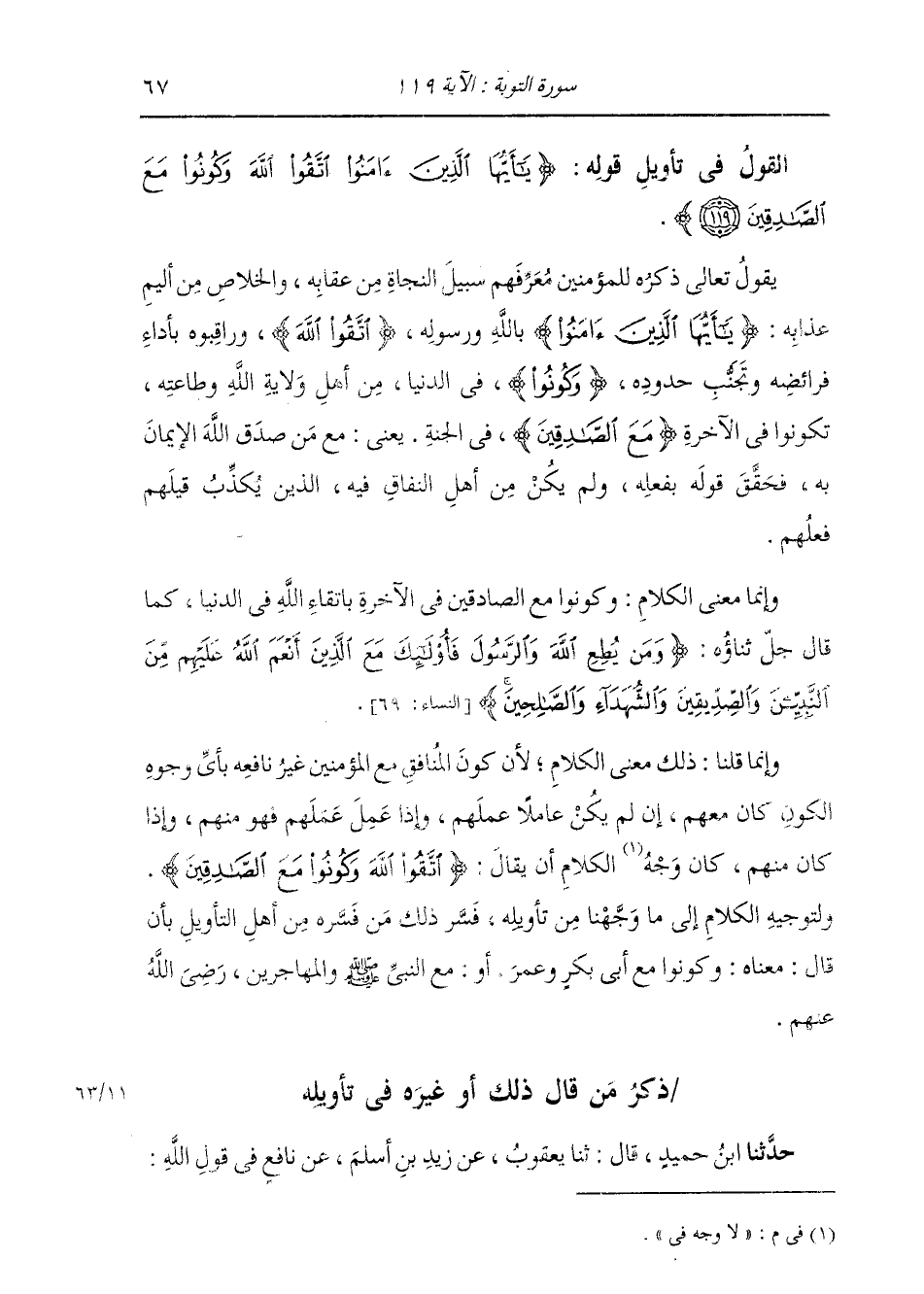 §الْقَوْلُ فِي تَأْوِيلِ قَوْلِهِ تَعَالَى: {يَا أَيُّهَا الَّذِينَ آمَنُوا اتَّقُوا اللَّهَ وَكُونُوا مَعَ الصَّادِقِينَ} [التوبة: 119] يَقُولُ تَعَالَى ذِكْرُهُ لِلْمُؤْمِنِينَ مُعَرِّفَهُمْ سَبِيلَ النَّجَاةِ مِنْ عِقَابِهِ وَالْخَلَاصِ مِنْ أَلِيمِ عَذَابِهِ: يَا أَيُّهَا الَّذِينَ آمَنُوا بِاللَّهِ وَرَسُولِهِ، اتَّقُوا اللَّهَ وَرَاقِبُوهُ بِأَدَاءِ فَرَائِضَهُ وَتَجَنُّبِ حُدُودَهُ، وَكُونُوا فِي الدُّنْيَا مِنْ أَهْلِ وِلَايَةِ اللَّهِ وَطَاعَتِهِ، تَكُونُوا فِي الْآخِرَةِ مَعَ الصَّادِقِينَ فِي الْجَنَّةِ. يَعْنِي مَعَ مَنْ صَدَقَ اللَّهَ الْإِيمَانَ بِهِ فَحَقَّقَ قَوْلَهُ بِفِعْلِهِ وَلَمْ يَكُنْ مِنْ أَهْلِ النِّفَاقِ فِيهِ الَّذِينَ يَكْذِبُ قِيلَهُمْ فِعْلُهُمْ وَإِنَّمَا مَعْنَى الْكَلَامِ: وَكُونُوا مَعَ الصَّادِقِينَ فِي الْآخِرَةِ بِاتِّقَاءِ اللَّهِ فِي الدُّنْيَا، كَمَا قَالَ جَلَّ ثَنَاؤُهُ: {وَمَنْ يُطِعِ اللَّهَ وَالرَّسُولَ فَأُولَئِكَ مَعَ الَّذِينَ أَنْعَمَ اللَّهُ عَلَيْهِمْ مِنَ النَّبِيِّينَ وَالصِّدِّيقِينَ وَالشُّهَدَاءِ وَالصَّالِحِينَ} [النساء: 69] وَإِنَّمَا قُلْنَا ذَلِكَ مَعْنَى الْكَلَامِ، لِأَنَّ كَوْنِ الْمُنَافِقِ مَعَ الْمُؤْمِنِينَ غَيْرُ نَافِعُهُ بِأَيِّ وُجُوهِ الْكَوْنِ كَانَ مَعَهُمْ إِنْ لَمْ يَكُنْ عَامِلًا عَمَلَهُمْ، وَإِذَا عَمِلَ عَمَلَهُمْ فَهُوَ مِنْهُمْ، وَإِذَا كَانَ مِنْهُمْ كَانَ لَا وَجْهَ فِي الْكَلَامِ أَنْ يُقَالَ: اتَّقُوا اللَّهَ وَكُونُوا مَعَ الصَّادِقِينَ. وَلِتَوْجِيهِ الْكَلَامَ إِلَى مَا وَجْهَنَا مِنْ تَأْوِيلِهِ فَسَّرَ ذَلِكَ مَنْ فَسَّرَهُ مِنْ أَهْلِ التَّأْوِيلِ بِأَنْ قَالَ: مَعْنَاهُ: وَكُونُوا مَعَ أَبِي بَكْرٍ وَعُمَرَ، أَوْ مَعَ النَّبِيِّ صَلَّى اللهُ عَلَيْهِ وَسَلَّمَ وَالْمُهَاجِرِينَ رَحْمَةُ اللَّهِ عَلَيْهِمْ ذِكْرُ مَنْ قَالَ ذَلِكَ أَوْ غَيْرَهُ فِي تَأْوِيلِهِ