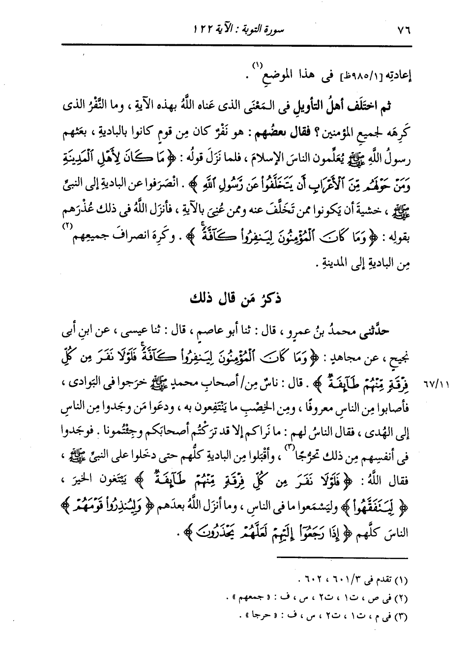 حَدَّثَنِي مُحَمَّدُ بْنُ عَمْرٍو، قَالَ: ثَنَا أَبُو عَاصِمٍ، قَالَ: ثَنَا عِيسَى، عَنِ ابْنِ أَبِي نَجِيحٍ، عَنْ مُجَاهِدٍ، " {§وَمَا كَانَ الْمُؤْمِنُونَ لِيَنْفِرُوا كَافَّةً فَلَوْلَا نَفَرَ مِنْ كُلِّ فِرْقَةٍ مِنْهُمْ طَائِفَةٌ} [التوبة: 122] قَالَ: نَاسٌ مِنْ أَصْحَابِ مُحَمَّدٍ صَلَّى اللهُ عَلَيْهِ وَسَلَّمَ خَرَجُوا فِي الْبَوَادِي، فَأَصَابُوا مِنَ النَّاسِ مَعْرُوفًا وَمَنَ الْخِصْبِ مَا يَنْتَفِعُونَ بِهِ، وَدَعُوا مَنْ وَجَدُوا مِنَ النَّاسِ إِلَى الْهُدَى، فَقَالَ النَّاسٌ لَهُمْ: مَا نَرَاكُمْ إِلَّا قَدْ تَرَكْتُمْ أَصْحَابَكُمْ وَجِئْتُمُونَا فَوَجَدُوا فِي أَنْفُسِهِمْ مِنْ ذَلِكَ حَرَجًا، وَأَقْبَلُوا مِنَ الْبَادِيَةِ كُلُّهُمْ حَتَّى دَخَلُوا عَلَى النَّبِيِّ صَلَّى اللهُ عَلَيْهِ وَسَلَّمَ، فَقَالَ اللَّهُ: {فَلَوْلَا نَفَرَ مِنْ كُلِّ فِرْقَةٍ مِنْهُمْ طَائِفَةٌ} [التوبة: 122] يَبْتَغُونَ الْخَيْرَ، {لِيَتَفَقَّهُوَا} [التوبة: 122] وَلِيَسْمَعُوا مَا فِي النَّاسِ، وَمَا أَنْزَلَ اللَّهُ بَعْدَهُمْ، {وَلِيُنْذِرُوا قَوْمَهُمْ} [التوبة: 122] النَّاسَ كُلَّهُمْ، {إِذَا رَجَعُوا إِلَيْهِمْ لَعَلَّهُمْ يَحْذَرُونَ} [التوبة: 122] " -[77]- حَدَّثَنَا الْمُثَنَّى، قَالَ: ثَنَا أَبُو حُذَيْفَةَ، قَالَ: ثَنَا شِبْلٌ، عَنِ ابْنِ أَبِي نَجِيحٍ، عَنْ مُجَاهِدٍ، مِثْلَهُ، إِلَّا أَنَّهُ قَالَ فِي حَدِيثِهِ: فَقَالَ اللَّهُ: {فَلَوْلَا نَفَرَ مِنْ كُلِّ فِرْقَةٍ مِنْهُمْ طَائِفَةٌ} [التوبة: 122] خَرَجَ بَعْضٌ وَقَعَدَ بَعْضٌ، يَبْتَغُونَ الْخَيْرَ قَالَ: ثَنَا إِسْحَاقُ، قَالَ: ثَنَا عَبْدُ اللَّهِ، عَنْ وَرْقَاءَ، عَنِ ابْنِ أَبِي نَجِيحٍ، عَنْ مُجَاهِدٍ نَحْوَ حَدِيثِهِ، عَنْ أَبِي حُذَيْفَةَ حَدَّثَنَا الْقَاسِمُ، قَالَ: ثَنَا الْحُسَيْنُ، قَالَ: ثَنِي حَجَّاجٌ، عَنِ ابْنِ جُرَيْجٍ، عَنْ مُجَاهِدٍ نَحْوَ حَدِيثِ الْمُثَنَّى عَنْ أَبِي حُذَيْفَةَ، غَيْرَ أَنَّهُ قَالَ فِي حَدِيثِهِ: مَا نَرَاكُمْ إِلَّا قَدْ تَرَكْتُمْ صَاحِبَكُمْ، وَقَالَ: {لِيَتَفَقَّهُوَا} [التوبة: 122] لِيَسْمَعُوا مَا فِي النَّاسِ وَقَالَ آخَرُونَ: مَعْنَى ذَلِكَ: وَمَا كَانَ الْمُؤْمِنُونَ لِيَنْفِرُوا جَمِيعًا إِلَى عَدُوِّهِمْ وَيَتْرُكُوا نَبِيَّهُمْ صَلَّى اللهُ عَلَيْهِ وَسَلَّمَ وَحْدَهُ. كَمَا