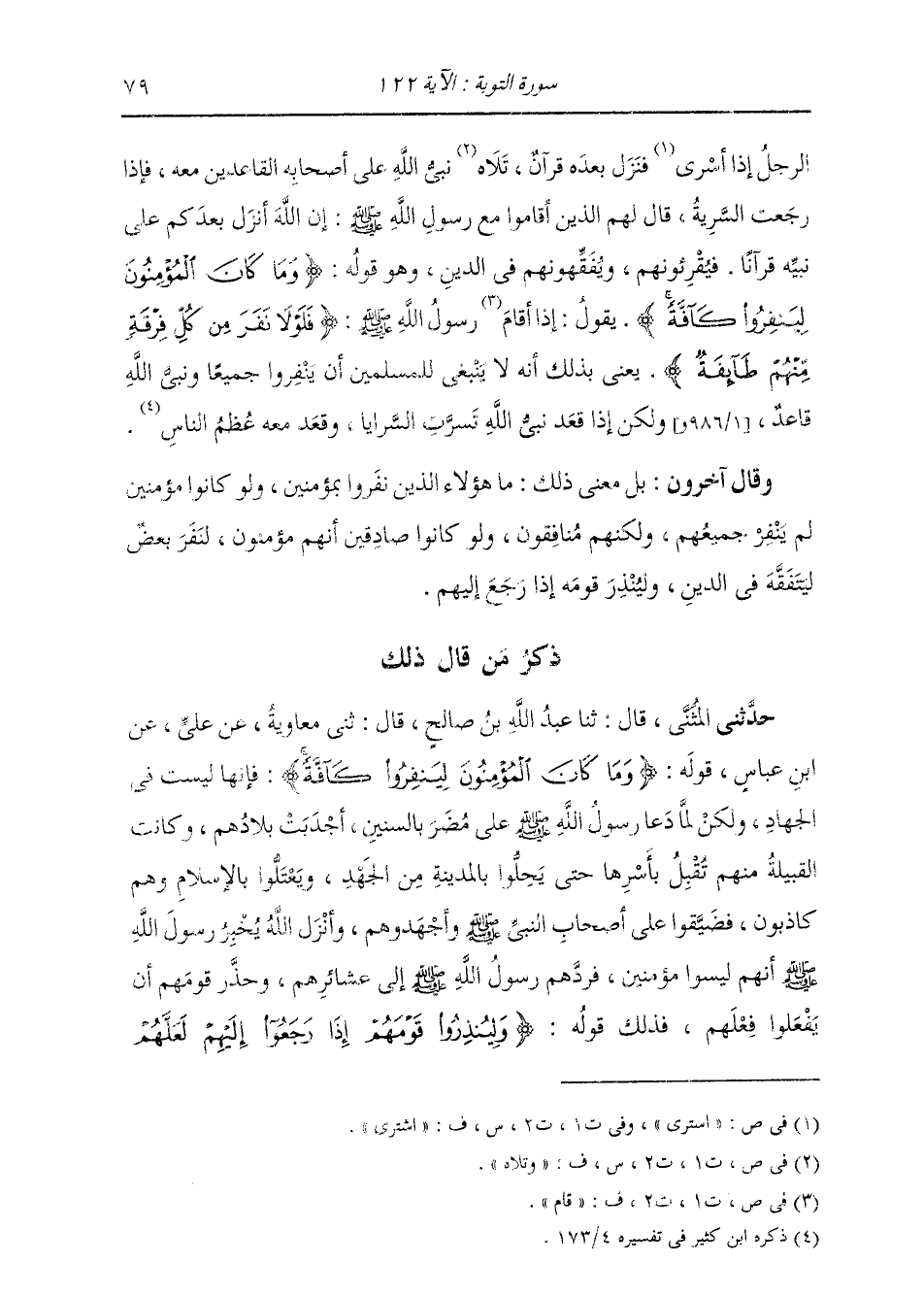 الرَّجُلُ إِذَا أَسْرَى فَنَزَلَ بَعْدَهُ قُرْآنٌ تَلَاهُ نَبِيُّ اللَّهِ عَلَى أَصْحَابِهِ الْقَاعِدِينَ مَعَهُ، فَإِذَا رَجَعَتِ السَّرِيَّةُ قَالَ لَهُمُ الَّذِينَ أَقَامُوا مَعَ رَسُولِ اللَّهِ صَلَّى اللهُ عَلَيْهِ وَسَلَّمَ: إِنَّ اللَّهَ أَنْزَلَ بَعْدَكُمْ عَلَى نَبِيِّهِ قُرْآنًا فَيُقْرِئُونَهُمْ وَيُفَقِّهُونَهُمْ فِي الدِّينِ. وَهُوَ قَوْلُهُ: {وَمَا كَانَ الْمُؤْمِنُونَ لِيَنْفِرُوا كَافَّةً} [التوبة: 122] يَقُولُ: إِذَا أَقَامَ رَسُولُ اللَّهِ صَلَّى اللهُ عَلَيْهِ وَسَلَّمَ، {فَلَوْلَا نَفَرَ مِنْ كُلِّ فِرْقَةٍ مِنْهُمْ طَائِفَةٌ} [التوبة: 122] يَعْنِي بِذَلِكَ أَنَّهُ لَا يَنْبَغِي لِلْمُسْلِمِينَ أَنْ يَنْفِرُوا جَمِيعًا وَنَبِيُّ اللَّهِ قَاعِدٌ، وَلَكِنْ إِذَا قَعَدَ نَبِيُّ اللَّهِ تَسَرَّتِ السَّرَايَا وَقَعَدَ مَعَهُ مُعْظَمُ النَّاسِ " وَقَالَ آخَرُونَ: بَلْ مَعْنَى ذَلِكَ: مَا هَؤُلَاءِ الَّذِينَ نَفَرُوا بِمُؤْمِنِينَ، وَلَوْ كَانُوا مُؤْمِنِينَ لَمْ يَنْفُرْ جَمِيعُهُمْ؛ وَلَكِنَّهُمْ مُنَافِقُونَ، وَلَوْ كَانُوا صَادِقِينَ أَنَّهُمْ مُؤْمِنُونَ لِنَفَرَ بَعْضٌ لِيَتَفَقَّهَ فِي الدِّينِ وَلِيُنْذِرَ قَوْمَهُ إِذَا رَجَعَ إِلَيْهِمْ. ذِكْرُ مَنْ قَالَ ذَلِكَ