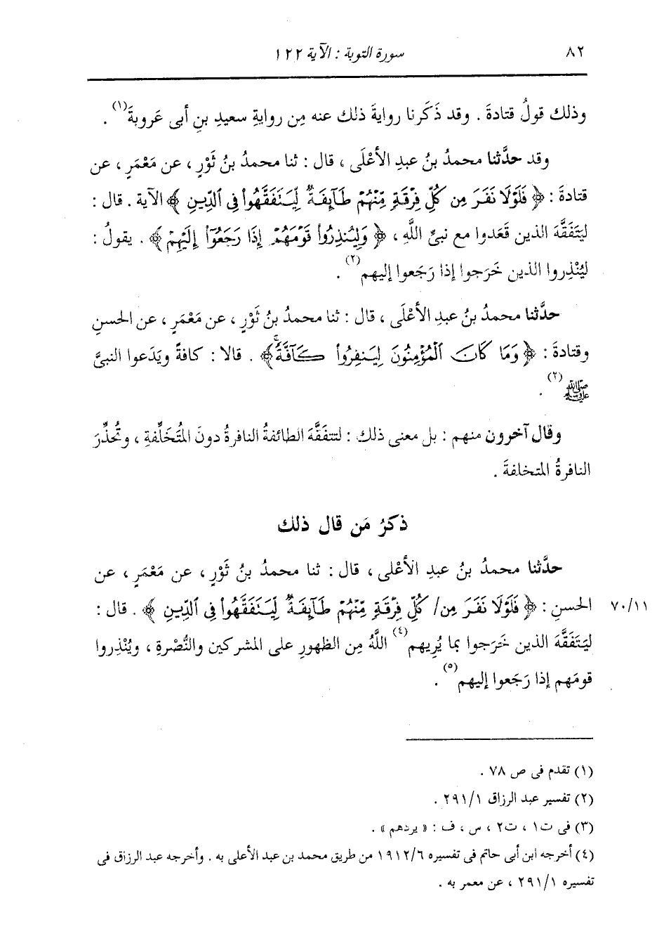 حَدَّثَنَا مُحَمَّدُ بْنُ عَبْدِ الْأَعْلَى، قَالَ. ثَنَا مُحَمَّدُ بْنُ ثَوْرٍ، عَنْ مَعْمَرٍ، عَنْ قَتَادَةَ، " {§فَلَوْلَا نَفَرَ مِنْ كُلِّ فِرْقَةٍ مِنْهُمْ طَائِفَةٌ لِيَتَفَقَّهُوَا فِي الدِّينِ} [التوبة: 122] . . الْآيَةَ، قَالَ: لِيَتَفَقَّهَ الَّذِينَ قَعَدُوا مَعَ نَبِيِّ اللَّهِ. {وَلِيُنْذِرُوا قَوْمَهُمْ إِذَا رَجَعُوا إِلَيْهِمْ} [التوبة: 122] يَقُولُ: لِيُنْذِرُوا الَّذِينَ خَرَجُوا إِذَا رَجَعُوا إِلَيْهِمْ "
