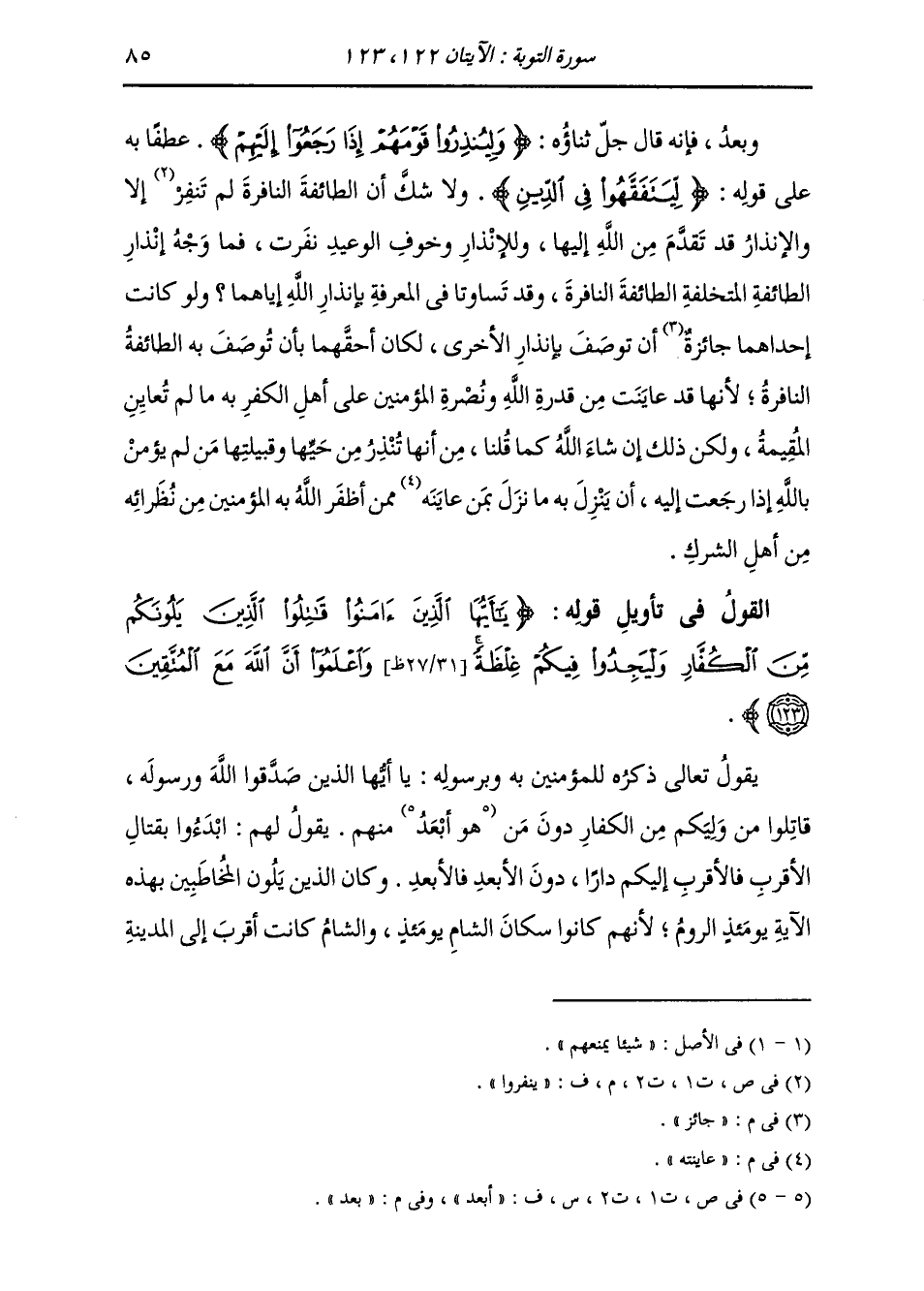 §الْقَوْلُ فِي تَأْوِيلِ قَوْلِهِ تَعَالَى: {يَا أَيُّهَا الَّذِينَ آمَنُوا قَاتِلُوا الَّذِينَ يَلُونَكُمْ مِنَ الْكُفَّارِ وَلْيَجِدُوا فِيكُمْ غِلْظَةً وَاعْلَمُوا أَنَّ اللَّهَ مَعَ الْمُتَّقِينَ} [التوبة: 123] يَقُولُ تَعَالَى ذِكْرُهُ لِلْمُؤْمِنِينَ بِهِ وَبِرَسُولِهِ: يَا أَيُّهَا الَّذِينَ صَدَّقُوا اللَّهَ وَرَسُولَهُ قَاتِلُوا مَنْ وَلِيَكُمْ مِنَ الْكُفَّارِ دُونَ مَنْ بَعُدَ مِنْهُمْ، يَقُولُ لَهُمُ: ابْدَءُوا بِقِتَالِ الْأَقْرَبِ فَالْأَقْرَبِ إِلَيْكُمْ دَارًا دُونَ الْأَبْعَدِ فَالْأَبْعَدِ. وَكَانَ الَّذِي يَلُونَ الْمُخَاطَبِينَ بِهَذِهِ الْآيَةِ يَوْمَئِذٍ الرُّومُ، لِأَنَّهُمْ كَانُوا سُكَّانَ الشَّامِ يَوْمَئِذٍ، وَالشَّامُ كَانَتْ أَقْرَبَ إِلَى الْمَدِينَةِ