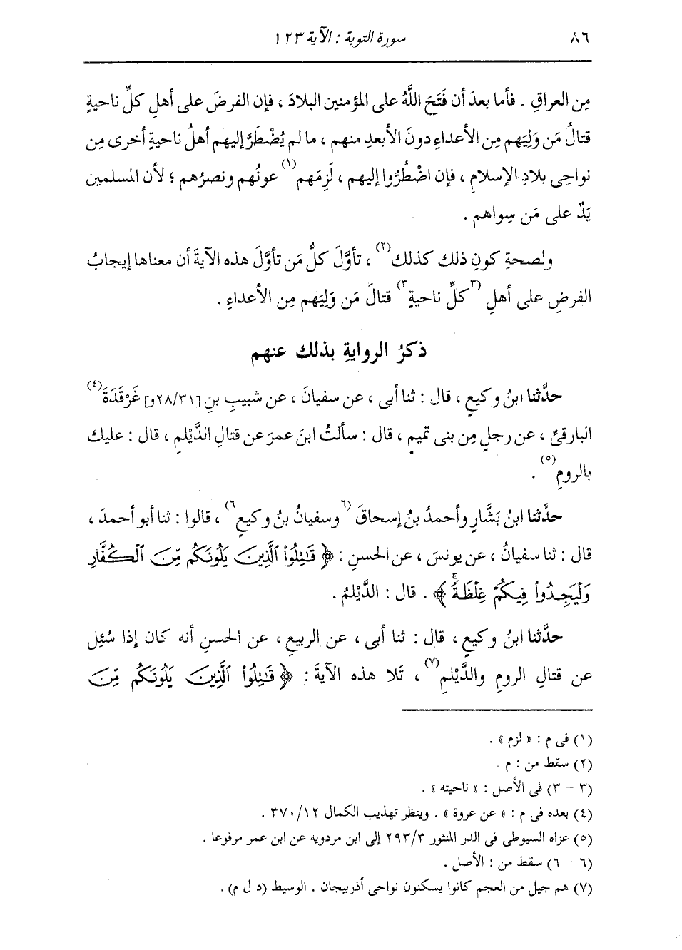 حَدَّثَنَا ابْنُ وَكِيعٍ، قَالَ: ثَنَا أَبِي، عَنِ الرَّبِيعِ، عَنِ الْحَسَنِ: أَنَّهُ كَانَ §إِذَا سُئِلَ عَنْ قِتَالِ الرُّومِ، وَالدَّيلَمِ، تَلَا هَذِهِ الْآيَةَ: {قَاتِلُوا الَّذِينَ يَلُونَكُمْ مِنَ -[87]- الْكُفَّارِ} [التوبة: 123] "