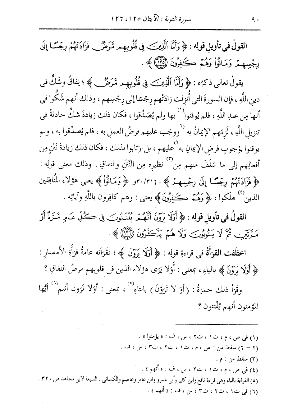 §الْقَوْلُ فِي تَأْوِيلِ قَوْلِهِ تَعَالَى: {أَوَلًا يَرَوْنَ أَنَّهُمْ يُفْتَنُونَ فِي كُلِّ عَامٍ مَرَّةً أَوْ مَرَّتَيْنِ ثُمَّ لَا يَتُوبُونَ وَلَا هُمْ يَذَّكَّرُونَ} [التوبة: 126] اخْتَلَفَتِ الْقُرَّاءُ فِي قِرَاءَةِ قَوْلِهِ: {أَوَلَا يَرَوْنَ} [التوبة: 126] فَقَرَأَتْهُ عَامَّةُ قُرَّاءِ الْأَمْصَارِ: " {أَوَلَا يَرَوْنَ} [التوبة: 126] " بِالْيَاءِ، بِمَعْنَى أَوَلَا يَرَى هَؤُلَاءِ الَّذِينَ فِي قُلْوبِهِمْ مَرِضُ النِّفَاقِ. وَقَرَأَ ذَلِكَ حَمْزَةُ: (أَوَلَا تَرَوْنَ) بِالتَّاءِ، بِمَعْنَى أَوَلَا تَرَوْنَ أَنْتُمْ أَيُّهَا الْمُؤْمِنُونَ أَنَّهُمْ يُفْتَنُونَ؟