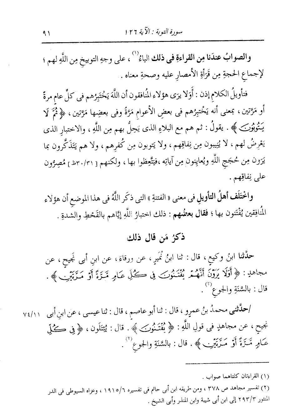 حَدَّثَنِي مُحَمَّدُ بْنُ عَمْرٍو، قَالَ: ثَنَا أَبُو عَاصِمٍ، قَالَ: ثَنَا عِيسَى، عَنِ ابْنِ أَبِي نَجِيحٍ، عَنْ مُجَاهِدٍ، فِي قَوْلِهِ: " {§يُفْتَنُونَ} [التوبة: 126] قَالَ: يُبْتَلَونَ، {فِي كُلِّ عَامٍ مَرَّةً أَوْ مَرَّتَيْنِ} [التوبة: 126] قَالَ: بِالسَّنَةِ وَالْجُوعِ "