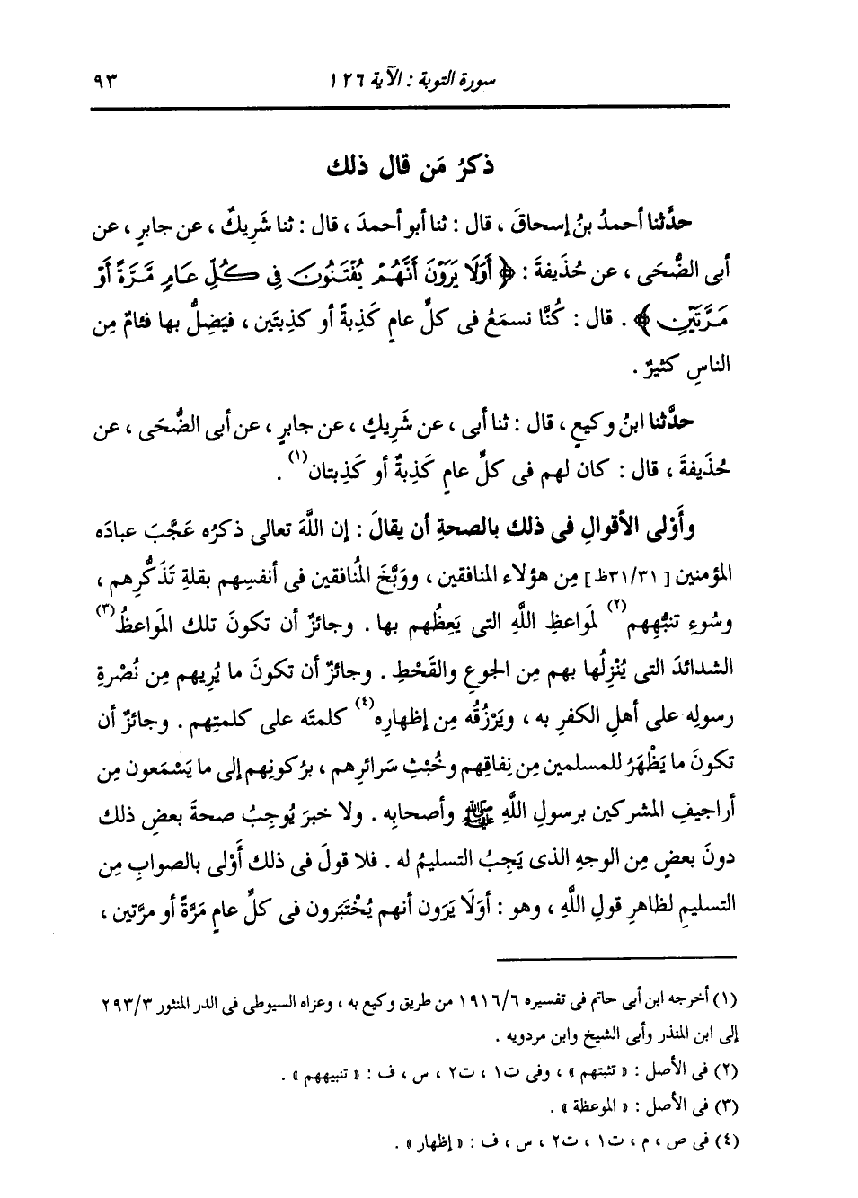 حَدَّثَنَا ابْنُ وَكِيعٍ، قَالَ: ثَنَا أَبِي، عَنْ شَرِيكٍ، عَنْ جَابِرٍ، عَنْ أَبِي الضُّحَى، عَنْ حُذَيْفَةَ، قَالَ: «§كَانَ لَهُمْ فِي كُلِّ عَامٍ كَذِبَةٌ أَوْ كَذِبَتَانِ» وَأَوْلَى الْأَقْوَالِ فِي ذَلِكَ بِالصِّحَّةِ أَنْ يُقَالَ: إِنَّ اللَّهَ عَجَّبَ عِبَادَهُ الْمُؤْمِنِينَ مِنْ هَؤُلَاءِ الْمُنَافِقِينَ، وَوَبَّخَ الْمُنَافِقِينَ فِي أَنْفُسِهِمْ بِقِلَّةِ تَذَكُّرِهِمْ وَسُوءِ تَنَبُّهِهِمْ لِمَوَاعِظِ اللَّهِ الَّتِي يَعِظُهُمْ بِهَا. وَجَائِزٌ أَنْ تَكُونَ تِلْكَ الْمَوَاعِظُ الشَّدَائِدَ الَّتِي يَنْزِلُهَا بِهِمْ مِنَ الْجُوعِ وَالْقَحْطِ، وَجَائِزٌ أَنْ تَكُونَ مَا يُرِيهِمْ مِنْ نُصْرَةِ رَسُولِهِ عَلَى أَهْلِ الْكُفْرِ بِهِ وَيَرْزُقَهُ مِنْ إِظْهَارِ كَلِمَتِهِ عَلَى كَلِمَتِهِمْ، وَجَائِزٌ أَنْ تَكُونَ مَا يَظْهَرُ لِلْمُسْلِمِينَ مِنْ نِفَاقِهِمْ وَخُبْثِ سَرَائِرِهِمْ بِرُكُونِهِمْ إِلَى مَا يَسْمَعُونَ مِنْ أَرَاجِيفِ الْمُشْرِكِينَ بِرَسُولِ اللَّهِ صَلَّى اللهُ عَلَيْهِ وَسَلَّمَ وَأَصْحَابِهِ. وَلَا خَبَرَ يُوجِبُ صِحَّةَ بَعْضِ ذَلِكَ، دُونَ بَعْضٍ مِنَ الْوَجْهِ الَّذِي يَجِبُ التَّسْلِيمُ لَهُ، وَلَا قَوْلَ فِي ذَلِكَ أَوْلَى بِالصَّوَابِ مِنَ التَّسْلِيمِ لِظَاهِرِ قَوْلِ اللَّهِ، وَهُوَ: أَوَلَا يَرَوْنَ أَنَّهُمْ يُخْتَبَرُونَ فِي كُلِّ عَامٍ مَرَّةً أَوْ مَرَّتَيْنِ