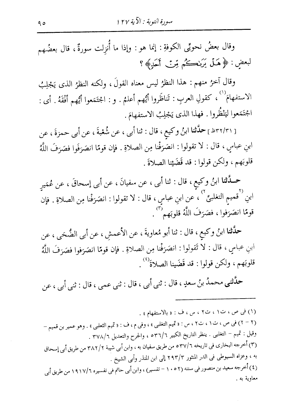وَقَالَ بَعْضُ نَحْويِّي الْكُوفَةِ: إِنَّمَا هُوَ: وَإِذَا مَا أُنْزِلَتْ سُورَةٌ قَالَ بَعْضُهُمْ لِبَعْضٍ: هَلْ يَرَاكُمْ مِنْ أَحَدٍ؟ وَقَالَ آخَرُ مِنْهُمْ: هَذَا النَّظَرُ لَيْسَ مَعْنَاهُ الْقَوْلُ، وَلَكَنَّهُ النَّظَرَ الَّذِي يَجْلِبُ الِاسْتِفْهَامَ كَقَوْلِ الْعَرَبِ: تَنَاظَرُوا أَيَّهُمْ أَعْلَمُ، وَاجْتَمَعُوا أَيَّهُمْ أَفْقَهُ؛ أَيْ اجْتَمَعُوا لِيَنْظُرُوا، فَهَذَا الَّذِي يُجْلِبُ الِاسْتِفْهَامَ