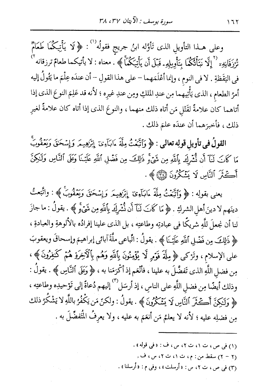 §الْقَوْلُ فِي تَأْوِيلِ قَوْلِهِ تَعَالَى: {وَاتَّبَعْتُ مِلَّةَ آبَائِي إِبْرَاهِيمَ وَإِسْحَاقَ وَيَعْقُوبَ مَا كَانَ لَنَا أَنَّ نُشْرِكَ بِاللَّهِ مِنْ شَيْءٍ ذَلِكَ مِنْ فَضْلِ اللَّهِ عَلَيْنَا وَعَلَى النَّاسِ وَلَكِنَّ أَكْثَرَ النَّاسِ لَا يَشْكُرُونَ} يَعْنِي بِقَوْلِهِ: {وَاتَّبَعْتُ مِلَّةَ آبَائِي إِبْرَاهِيمَ وَإِسْحَاقَ وَيَعْقُوبَ} وَاتَّبَعْتُ دِينَهُمْ لَا دِينَ أَهْلِ الشِّرْكِ. {مَا كَانَ لَنَا أَنَّ نُشْرِكَ بِاللَّهِ مِنْ شَيْءٍ} [يوسف: 38] يَقُولُ: مَا جَازَ لَنَا أَنَّ نَجْعَلَ لِلَّهِ شَرِيكًا فِي عِبَادَتِهِ وَطَاعَتِهِ، بَلِ الَّذِي عَلَيْنَا إِفْرَادُهُ بِالْأُلُوهَةِ وَالْعِبَادَةِ. {ذَلِكَ مِنْ فَضْلِ اللَّهِ عَلَيْنَا} [يوسف: 38] يَقُولُ: اتِّبَاعِي مِلَّةَ آبَائِي إِبْرَاهِيمَ وَإِسْحَاقَ وَيَعْقُوبَ عَلَى الْإِسْلَامِ، وَتَرْكِي {مِلَّةَ قَوْمٍ لَا يُؤْمِنُونَ بِاللَّهِ وَهُمْ بِالْآخِرَةِ هُمْ كَافِرُونَ} [يوسف: 37] ، مِنْ فَضْلِ اللَّهِ الَّذِي تَفَضَّلَ بِهِ عَلَيْنَا، فَأَنْعَمَ إِذْ أَكْرَمَنَا بِهِ {وَعَلَى النَّاسِ} [يوسف: 38] يَقُولُ: وَذَلِكَ أَيْضًا مِنْ فَضْلِ اللَّهِ عَلَى النَّاسِ، إِذْ أَرْسَلَنَا إِلَيْهِمْ دُعَاةً إِلَى تَوْحِيدِهِ وَطَاعَتِهِ. {وَلَكِنَّ أَكْثَرَ النَّاسِ لَا يَشْكُرُونَ} [البقرة: 243] يَقُولُ: وَلَكِنَّ مَنْ يَكْفُرُ بِاللَّهِ لَا يَشْكُرُ ذَلِكَ مِنْ فَضْلِهِ عَلَيْهِ، لِأَنَّهُ لَا يَعْلَمُ مَنْ أَنْعَمَ بِهِ عَلَيْهِ وَلَا يَعْرِفُ الْمُتَفَضِّلَ بِهِ.