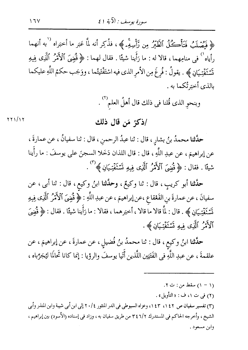 حَدَّثَنَا أَبُو كُرَيْبٍ، قَالَ: ثَنَا وَكِيعٌ؛ وحَدَّثَنَا ابْنُ وَكِيعٍ، قَالَ: ثَنَا أَبِي، عَنْ سُفْيَانَ، عَنْ عُمَارَةَ بْنِ الْقَعْقَاعِ، عَنْ إِبْرَاهِيمَ، عَنْ عَبْدِ اللَّهِ: " {§قُضِيَ الْأَمْرُ الَّذِي فِيهِ تَسْتَفْتِيَانِ} [يوسف: 41] قَالَ: لَمَّا قَالَا مَا قَالَا، أَخْبَرَهُمَا، فَقَالَا: مَا رَأَيْنَا شَيْئًا فَقَالَ: {قُضِيَ الْأَمْرُ الَّذِي فِيهِ تَسْتَفْتِيَانِ} [يوسف: 41] "