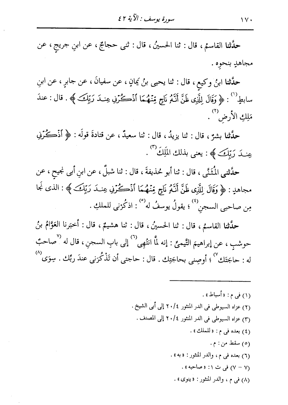 حَدَّثَنَا ابْنُ وَكِيعٍ، قَالَ: ثَنَا يَحْيَى بْنُ يَمَانٍ، عَنْ سُفْيَانَ، عَنْ جَابِرٍ، عَنْ أَسْبَاطٍ، " {§وَقَالَ لِلَّذِي ظَنَّ أَنَّهُ نَاجٍ مِنْهُمَا اذْكُرْنِي عِنْدَ رَبِّكَ} [يوسف: 42] قَالَ: عِنْدَ مَلِكِ الْأَرْضِ "