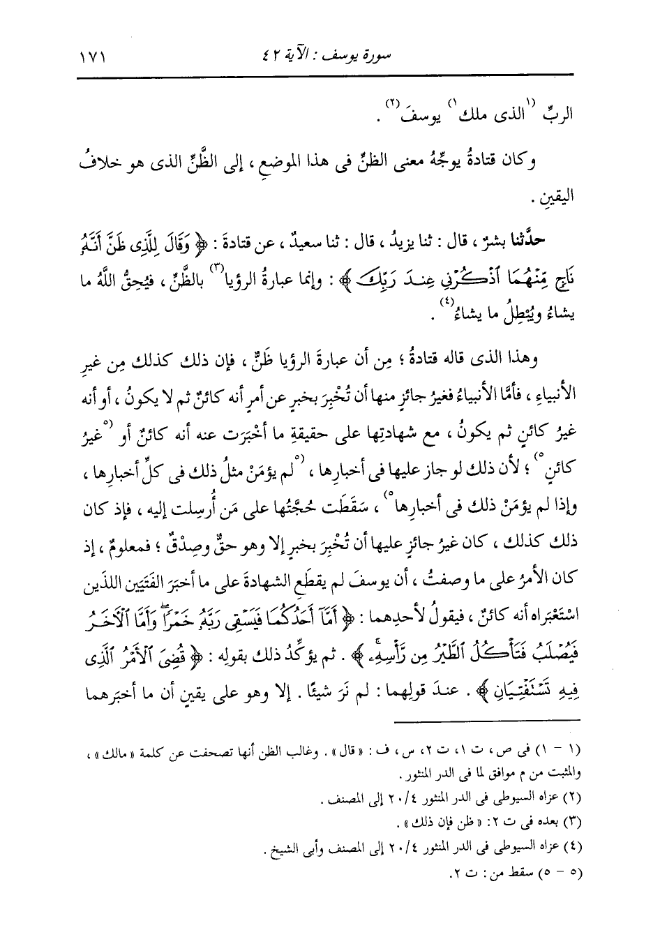 حَدَّثَنَا بِشْرٌ، قَالَ: ثَنَا يَزِيدُ، قَالَ: ثَنَا سَعِيدٌ، عَنْ قَتَادَةَ، " {§وَقَالَ لِلَّذِي ظَنَّ أَنَّهُ نَاجٍ مِنْهُمَا اذْكُرْنِي عِنْدَ رَبِّكَ} [يوسف: 42] وَإِنَّمَا عِبَارَةُ الرُّؤْيَا بِالظَّنِّ، فَيَحِقُّ اللَّهُ مَا يَشَاءُ وَيَبْطُلُ مَا يَشَاءُ " وَهَذَا الَّذِي قَالَهُ قَتَادَةُ مِنْ أَنَّ عِبَارَةَ الرُّؤْيَا ظَنٌّ، فَإِنَّ ذَلِكَ كَذَلِكَ مِنْ غَيْرِ الْأَنْبِيَاءِ. فَأَمَّا الْأَنْبِيَاءُ فَغَيْرُ جَائِزٍ مِنْهَا أَنْ تُخْبِرَ بِخَبَرٍ عَنْ أَمْرٍ أَنَّهُ كَائِنٌ ثُمَّ لَا يَكُونُ، أَوْ أَنَّهُ غَيْرُ كَائِنٍ ثُمَّ يَكُونُ مَعَ شَهَادَتِهَا عَلَى حَقِيقَةِ مَا أَخْبَرَتْ عَنْهُ أَنَّهُ كَائِنٌ أَوْ غَيْرُ كَائِنٍ؛ لِأَنَّ ذَلِكَ لَوْ جَازَ عَلَيْهَا فِي إِخْبَارِهَا لَمْ يُؤْمَنْ مِثْلُ ذَلِكَ فِي كُلِّ أَخْبَارِهَا، وَإِذَا لَمْ يُؤْمَنْ ذَلِكَ فِي أَخْبَارِهَا سَقَطَتْ حُجَّتُهَا عَلَى مَنْ أُرْسِلَتْ إِلَيْهِ. فَإِذَا كَانَ ذَلِكَ كَذَلِكَ كَانَ غَيْرُ جَائِزٍ عَلَيْهَا أَنْ تُخْبِرَ بِخَبَرٍ إِلَّا وَهُوَ حَقٌّ وَصِدْقٌ. فَمَعْلُومٌ إِذْ كَانَ الْأَمْرُ عَلَى مَا وَصَفْتُ أَنَّ يُوسُفَ لَمْ يَقْطَعِ الشَّهَادَةَ عَلَى مَا أَخْبَرَ الْفَتَيَيْنِ اللَّذَيْنِ اسْتَعْبَرَاهُ أَنَّهُ كَائِنٌ، فَيَقُولُ لِأَحَدِهِمَا: {أَمَّا أَحَدُكُمَا فَيَسْقِي رَبَّهُ خَمْرًا وَأَمَّا الْآخَرُ فَيُصْلَبُ فَتَأْكُلُ الطَّيْرُ مِنْ رَأْسِهِ} [يوسف: 41] ثُمَّ يُؤَكِّدُ ذَلِكَ بِقَوْلِهِ: {قُضِيَ الْأَمْرُ الَّذِي فِيهِ تَسْتَفْتِيَانِ} [يوسف: 41] عِنْدَ قَوْلِهِمَا: لَمْ تَرَ شَيْئًا، إِلَّا وَهُوَ عَلَى يَقِينٍ أَنَّ مَا أَخْبَرَهُمَا -[172]- بِحُدُوثِهِ، وَكَوْنِهِ أَنَّهُ كَائِنٌ لَا مَحَالَةَ لَا شَكَّ فِيهِ، وَلِيَقِينِهِ بِكَوْنِ ذَلِكَ قَالَ لِلْنَاجِي مِنْهُمَا: {اذْكُرْنِي عِنْدَ رَبِّكَ} [يوسف: 42] فَبَيَّنَ إِذَنْ بِذَلِكَ فَسَادَ الْقَوْلِ الَّذِي قَالَهُ قَتَادَةُ فِي مَعْنَى قَوْلِهِ: {وَقَالَ لِلَّذِي ظَنَّ أَنَّهُ نَاجٍ مِنْهُمَا} [يوسف: 42]