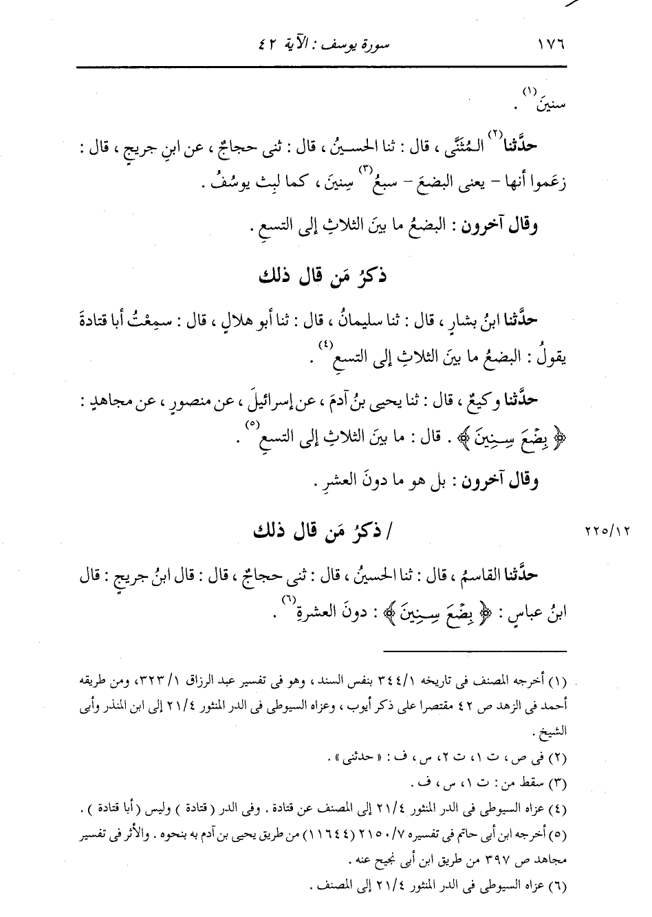 حَدَّثَنَا الْقَاسِمُ، قَالَ: ثَنَا الْحُسَيْنُ، قَالَ: ثَنِي حَجَّاجٌ، قَالَ: قَالَ ابْنُ جُرَيْجٍ، قَالَ ابْنُ عَبَّاسٍ: " {§بِضْعَ سِنِينَ} [يوسف: 42] دُونَ الْعَشَرَةِ " -[177]- وَزَعَمَ الْفَرَّاءُ أَنَّ الْبِضْعَ لَا يُذْكَرُ إِلَّا مَعَ الْعَشْرِ، وَمَعَ الْعِشْرِينَ إِلَى التِّسْعِينَ، وَهُوَ نَيِّفٌ مَا بَيْنَ الثَّلَاثَةِ إِلَى التِّسْعَةِ. وَقَالَ: كَذَلِكَ رَأَيْتُ الْعَرَبَ تَفْعَلُ، وَلَا يَقُولُونَ: بِضْعُ وَمِئةٌ، وَلَا بِضْعُ وَأَلْفٌ، وَإِذَا كَانَتْ لِلْذُكْرَانِ قِيلَ: بِضْعٌ. وَالصَّوَابُ فِي الْبِضْعِ مِنَ الثَّلَاثِ إِلَى التِّسْعِ إِلَى الْعَشْرِ، وَلَا يَكُونُ دُونَ الثَّلَاثِ، وَكَذَلِكَ مَا زَادَ عَلَى الْعِقْدِ إِلَى الْمِئَةِ، وَمَا زَادَ عَلَى الْمِئَةِ، فَلَا يَكُونُ فِيهِ بِضْعٌ