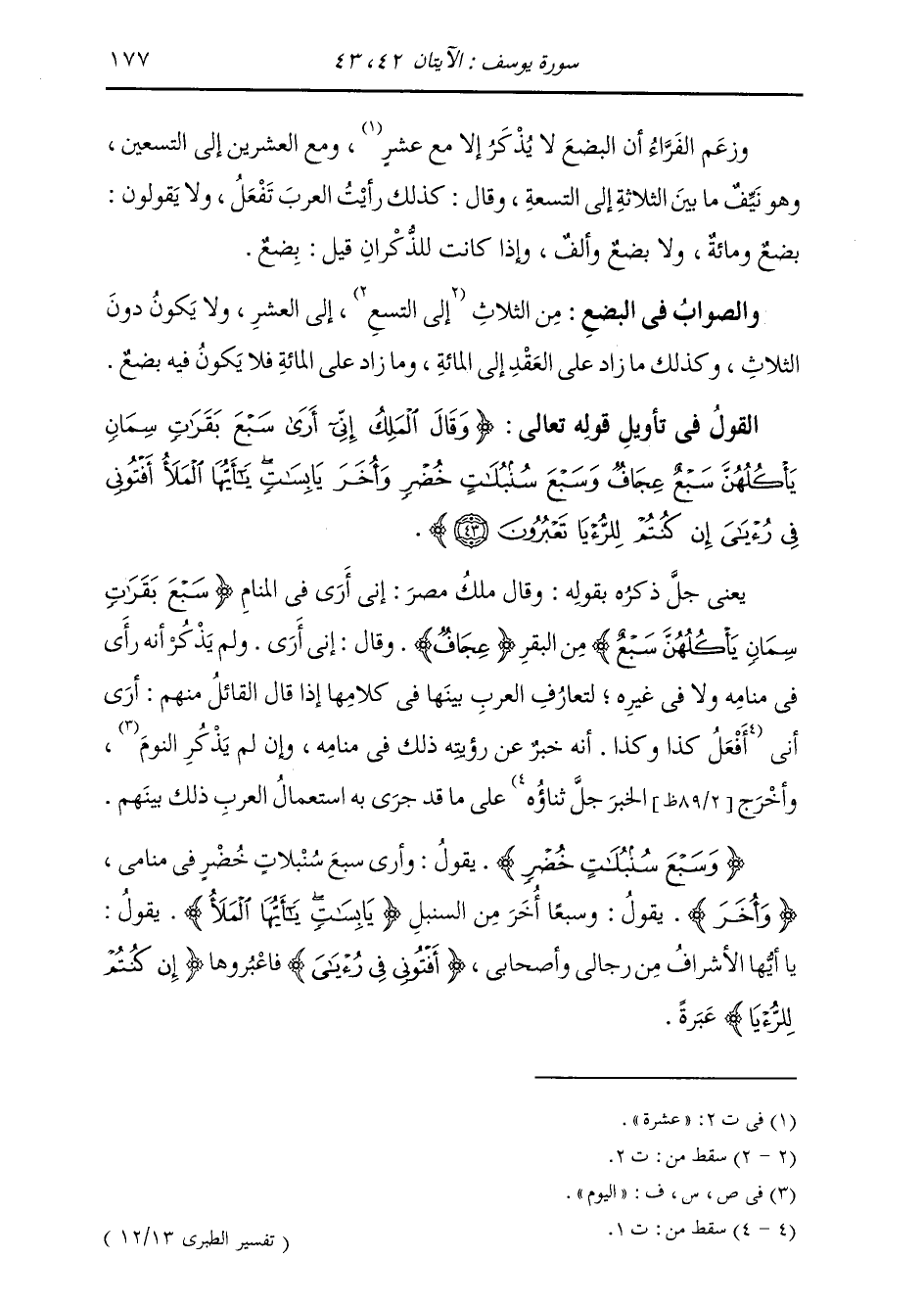 §الْقَوْلُ فِي تَأْوِيلِ قَوْلِهِ تَعَالَى: {وَقَالَ الْمَلِكُ إِنِّي أَرَى سَبْعَ بَقَرَاتٍ سِمَانٍ يَأْكُلُهُنَّ سَبْعٌ عِجَافٌ وَسَبْعَ سُنْبُلَاتٍ خُضْرٍ وَأُخَرَ يَابِسَاتٍ يَا أَيُّهَا الْمَلَأُ أَفْتُونِي فِي رُؤْيَايَ إِنْ كُنْتُمْ لِلرُّؤْيَا تَعْبُرُونَ} [يوسف: 43] يَعْنِي جَلَّ ذِكْرُهُ بِقَوْلِهِ: وَقَالَ مَلِكُ مِصْرَ {إِنِّي أَرَى} [الأنفال: 48] فِي الْمَنَامِ {سَبْعَ بَقَرَاتٍ سِمَانٍ يَأْكُلُهُنَّ سَبْعٌ} [يوسف: 43] مِنَ الْبَقَرِ {عِجَافٌ} [يوسف: 43] وَقَالَ: {إِنِّي أَرَى} [الأنفال: 48] ، وَلَمْ يَذْكُرْ أَنَّهُ رَأَى فِي مَنَامِهِ وَلَا فِي غَيْرِهِ، لِتَعَارُفِ الْعَرَبِ بَيْنَهَا فِي كَلَامِهَا إِذَا قَالَ الْقَائِلُ مِنْهُمْ: أَرَى أَنِّي أَفْعَلُ كَذَا وَكَذَا أَنَّهُ خَبَرٌ عَنْ رُؤْيَتِهِ ذَلِكَ فِي مَنَامِهِ، وَإِنْ لَمْ يَذْكُرِ النَّوْمَ. وَأَخْرَجَ الْخَبَرَ جَلَّ ثَنَاؤُهُ عَلَى مَا قَدْ جَرَى بِهِ اسْتِعْمَالُ الْعَرَبِ ذَلِكَ بَيْنَهُمْ. {وَسَبْعَ سُنْبُلَاتٍ خُضْرٍ} [يوسف: 43] يَقُولُ: وَأَرَى سَبْعَ سُنْبُلَاتٍ خُضْرٍ فِي مَنَامِي. {وَأُخَرَ} [آل عمران: 7] يَقُولُ: وَسَبْعًا أُخَرَ مِنَ السُّنْبُلِ {يَابِسَاتٍ يَا أَيُّهَا الْمَلَأُ} [يوسف: 43] يَقُولُ: يَا أَيُّهَا الْأَشْرَافُ مِنْ رِجَالِي وَأَصْحَابِي {أَفْتُونِي فِي رُؤْيَايَ} [يوسف: 43] فَاعْبُرُوهَا