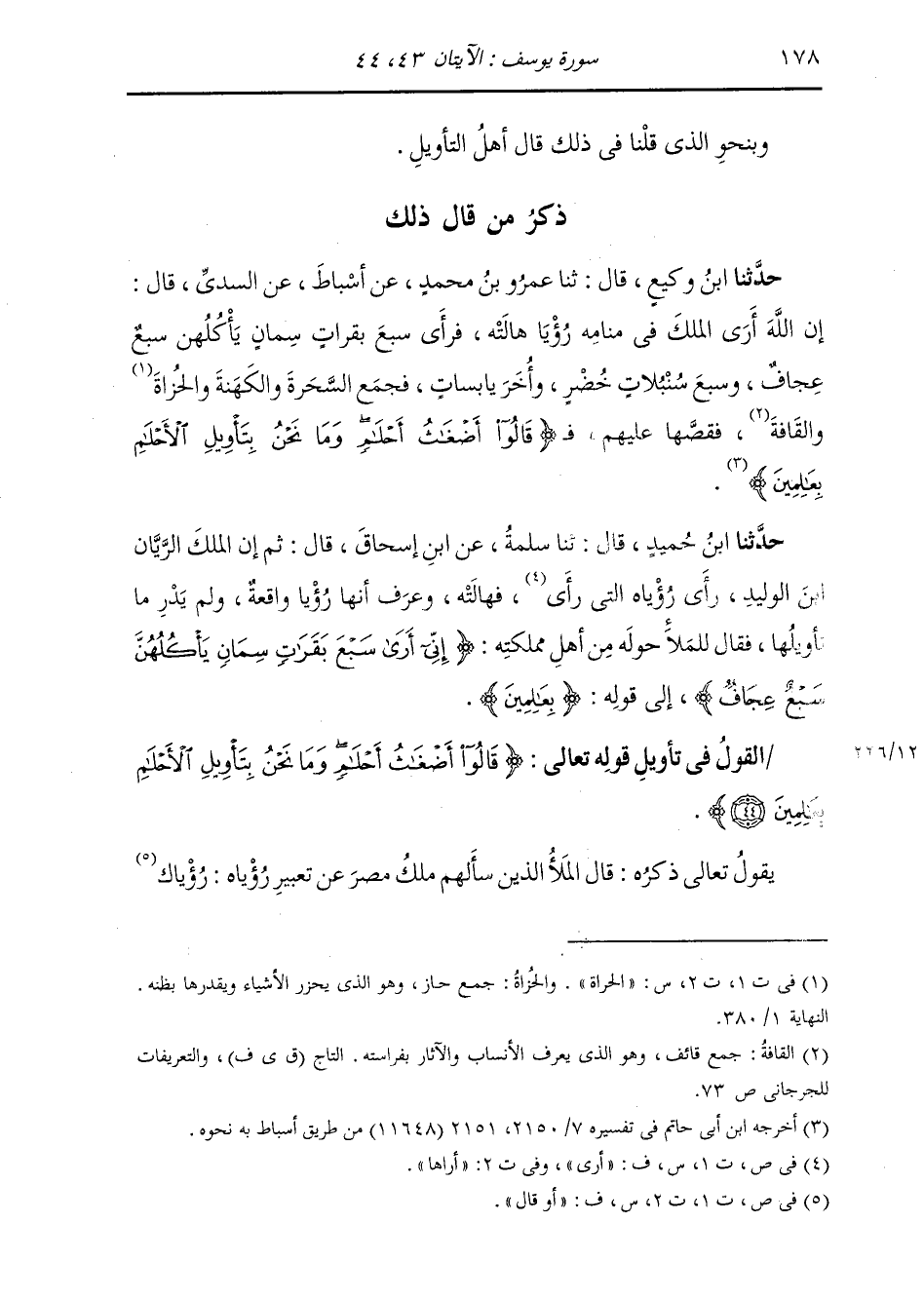 حَدَّثَنَا ابْنُ وَكِيعٍ، قَالَ: ثَنَا عَمْرُو بْنُ مُحَمَّدٍ، عَنْ أَسْبَاطٍ، عَنِ السُّدِّيِّ، قَالَ: " إِنَّ §اللَّهَ أَرَى الْمَلِكَ فِي مَنَامِهِ رُؤْيَا هَالَتْهُ، فَرَأَى سَبْعَ بَقَرَاتٍ سِمَانٍ يَأْكُلُهُنَّ سَبْعٌ عِجَافٌ، وَسَبْعَ سُنْبُلَاتٍ خُضْرٍ وَأُخَرَ يَابِسَاتٍ. فَجَمَعَ السَّحَرَةَ وَالْكَهَنَةَ وَالْحُزَاةَ وَالْقَافَةَ، فَقَصَّهَا عَلَيْهِمْ. {قَالُوا أَضْغَاثُ أَحْلَامٍ وَمَا نَحْنُ بِتَأْوِيلِ الْأَحْلَامِ بِعَالِمِينَ} [يوسف: 44] "