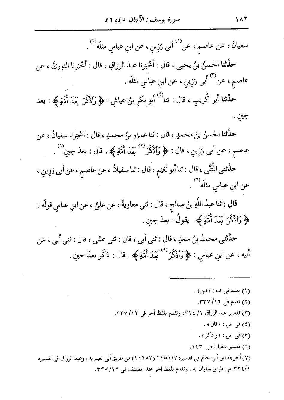 حَدَّثَنَا الْحَسَنُ بْنُ مُحَمَّدٍ، قَالَ: ثَنَا عَمْرُو بْنُ مُحَمَّدٍ، قَالَ: أَخْبَرَنَا سُفْيَانُ، عَنْ عَاصِمٍ، عَنْ أَبِي رَزِينٍ، قَالَ: " {§وَادَّكَرَ بَعْدَ أُمَّةٍ} [يوسف: 45] قَالَ: بَعْدَ حِينٍ " حَدَّثَنِي الْمُثَنَّى، قَالَ: ثَنَا أَبُو نُعَيْمٍ، قَالَ: ثَنَا سُفْيَانُ، عَنْ عَاصِمٍ، عَنْ أَبِي رَزِينٍ، عَنِ ابْنِ عَبَّاسٍ مِثْلَهُ