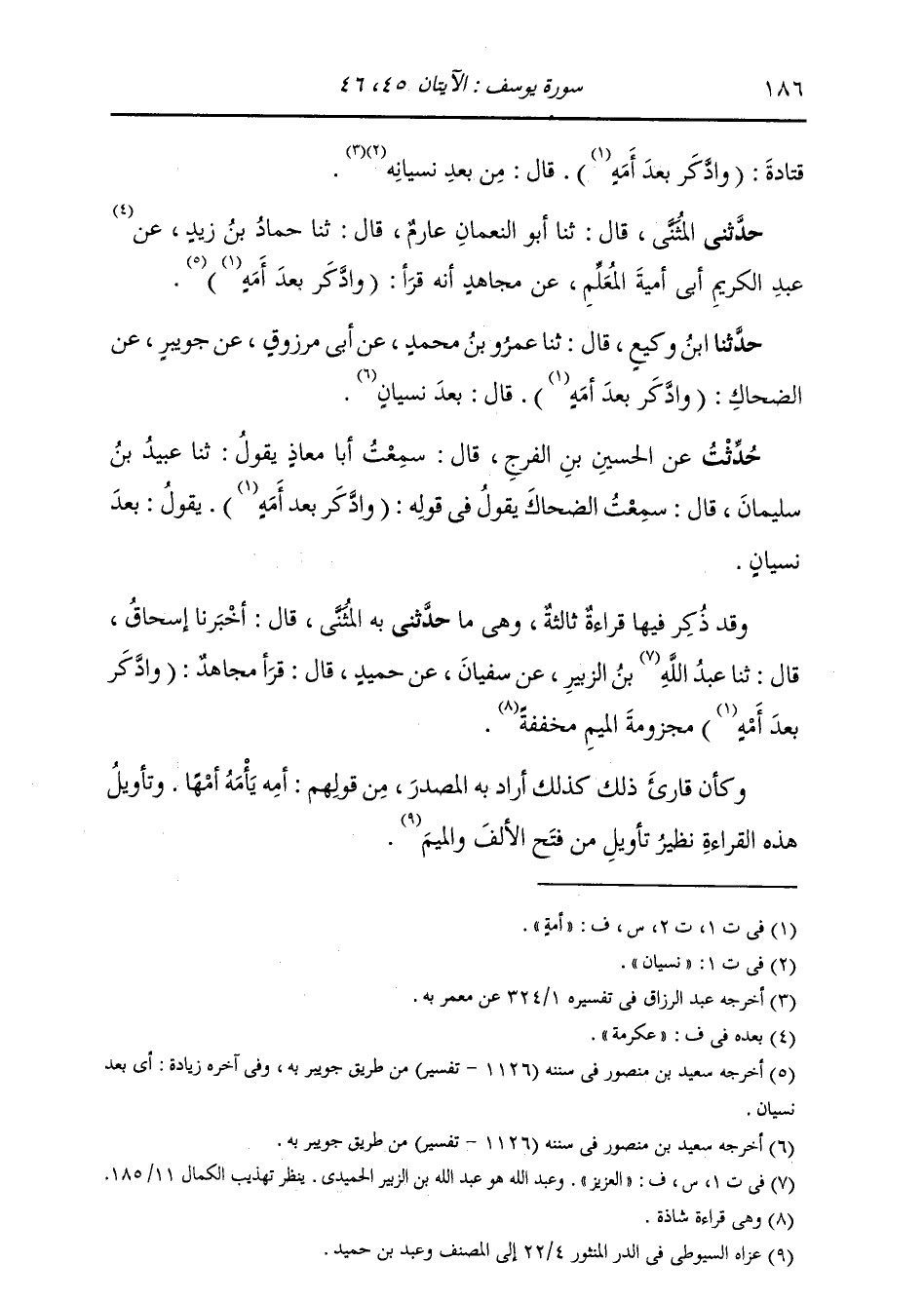حَدَّثَنِي الْمُثَنَّى، قَالَ: ثَنَا أَبُو النُّعْمَانِ عَارِمٌ، قَالَ: ثَنَا حَمَّادُ بْنُ زَيْدٍ، عَنْ عَبْدِ الْكَرِيمِ أَبِي أُمَيَّةَ الْمُعَلِّمِ، عَنْ مُجَاهِدٍ، " أَنَّهُ §قَرَأَ: «وَادَّكَرَ بَعْدَ أُمَّةٍ»