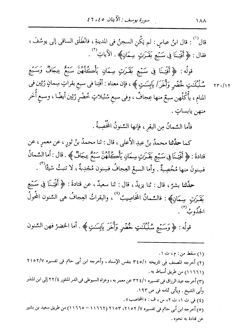 §قَوْلُهُ: {أَفْتِنَا فِي سَبْعِ بَقَرَاتٍ سِمَانٍ يَأْكُلُهُنَّ سَبْعٌ عِجَافٌ وَسَبْعَ سُنْبُلَاتٍ خُضْرٍ وَأُخَرَ يَابِسَاتٍ} [يوسف: 46] فَإِنَّ مَعْنَاهُ: أَفْتِنَا فِي سَبْعِ بَقَرَاتٍ سِمَانٍ رُئِينَ فِي الْمَنَامِ يَأْكُلُهُنَّ سَبْعٌ مِنْهَا عِجَافٌ، وَفِي سَبْعِ سُنْبُلَاتٍ خُضْرٍ رُئِينَ أَيْضًا، وَسَبْعٌ أُخَرَ مِنْهُنَّ يَابِسَاتٍ. فَأَمَّا السَّمَّانُ مِنَ الْبَقَرِ: فَإِنَّهَا السِّنُونَ الْمُخْصَبةُ