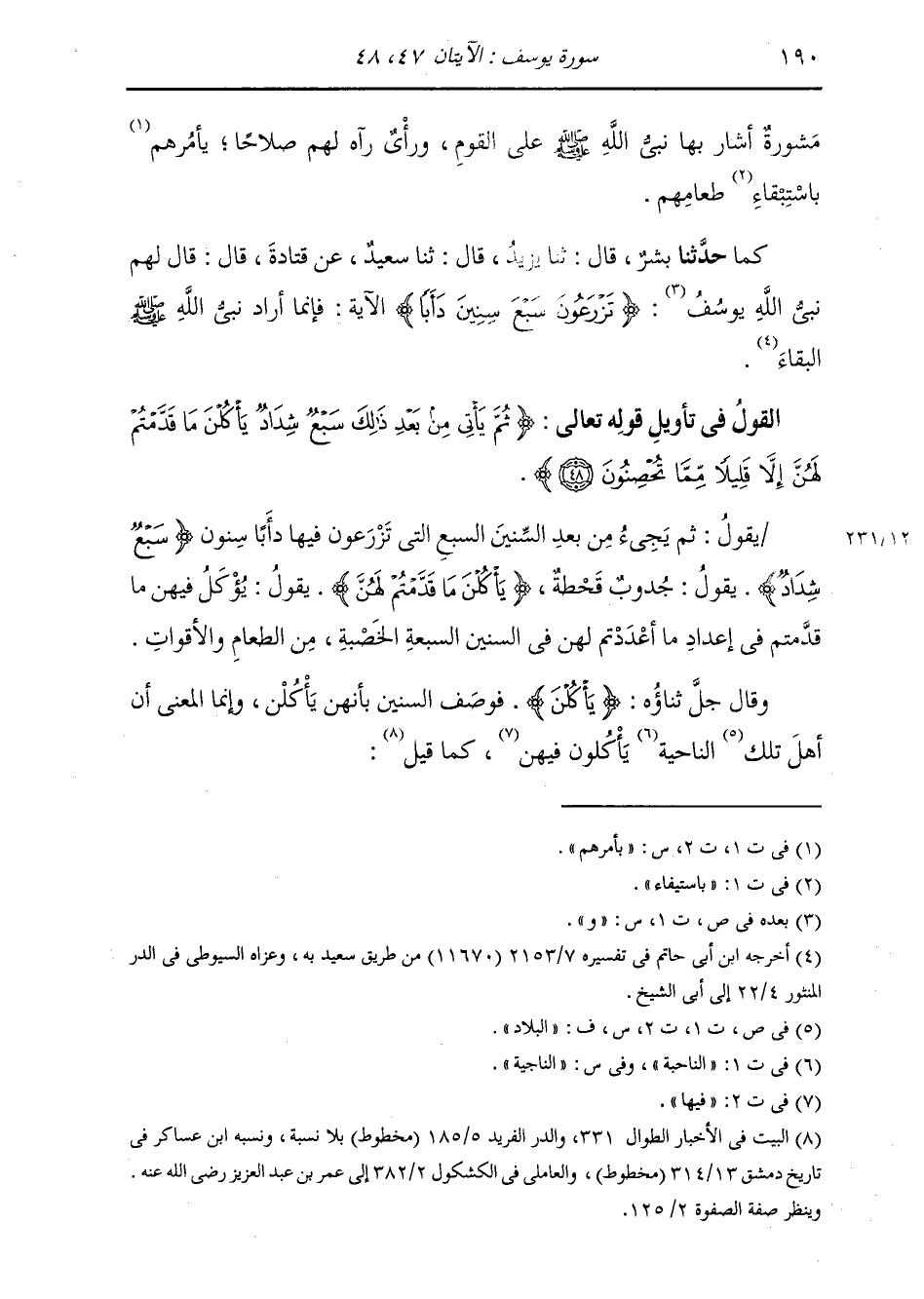 كَمَا: حَدَّثَنَا بِشْرٌ، قَالَ: ثَنَا يَزِيدُ، قَالَ: ثَنَا سَعِيدٌ، عَنْ قَتَادَةَ، قَالَ: " §قَالَ لَهُمْ نَبِيُّ اللَّهِ يُوسُفُ {تَزْرَعُونَ سَبْعَ سِنِينَ دَأَبًا} [يوسف: 47] . الْآيَةَ، فَإِنَّمَا أَرَادَ نَبِيُّ اللَّهِ صَلَّى اللهُ عَلَيْهِ وَسَلَّمَ الْبَقَاءَ "
