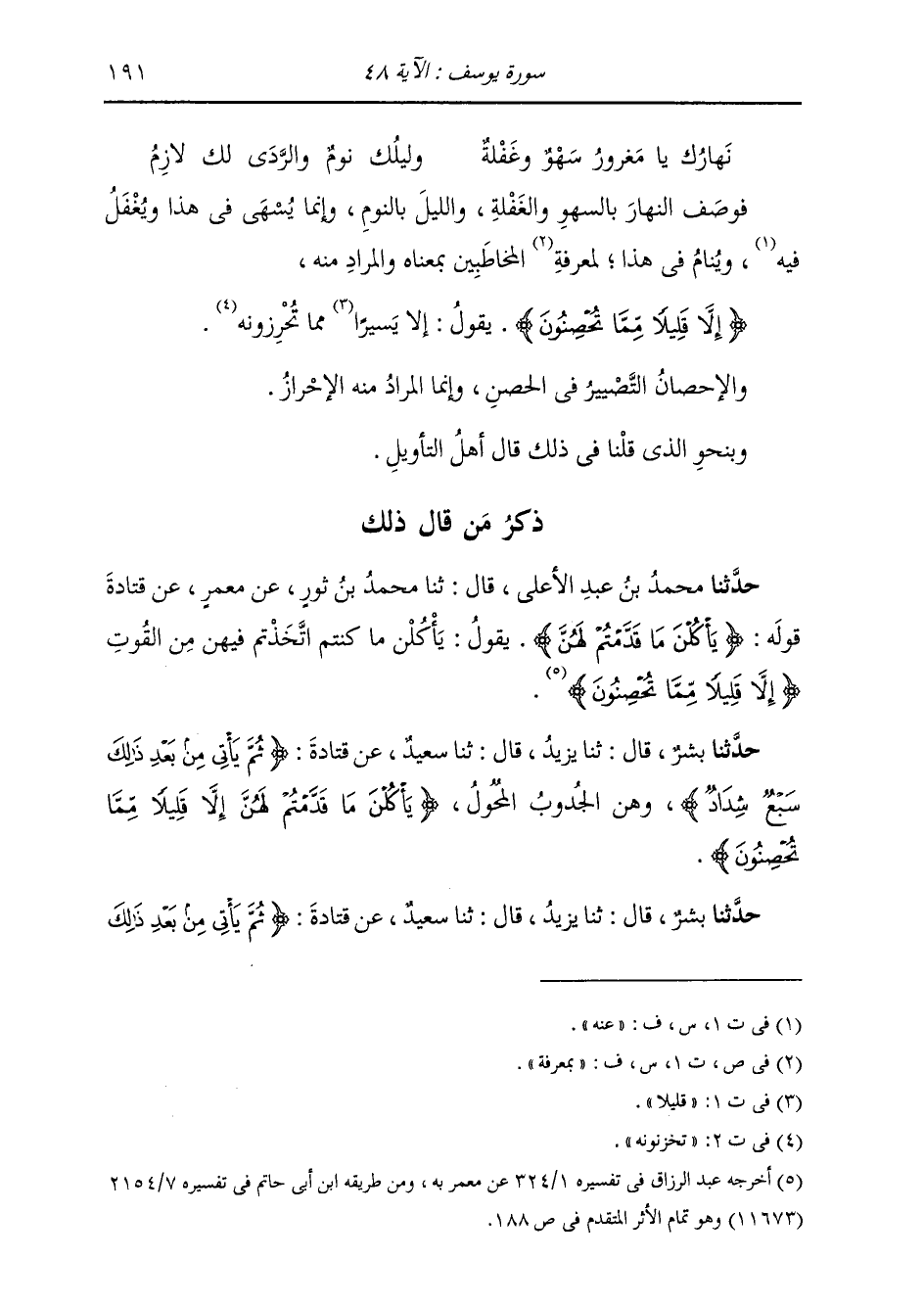حَدَّثَنَا مُحَمَّدُ بْنُ عَبْدِ الْأَعْلَى، قَالَ: ثَنَا مُحَمَّدُ بْنُ ثَوْرٍ، عَنْ مَعْمَرٍ، عَنْ قَتَادَةَ، قَوْلُهُ: " {§يَأْكُلْنَ مَا قَدَّمْتُمْ لَهُنَّ} [يوسف: 48] يَقُولُ يَأْكُلْنَ مَا كُنْتُمْ اتَّخَذْتُمْ فِيهِنَّ مِنَ الْقُوتِ، {إِلَّا قَلِيلًا مِمَّا تُحْصِنُونَ} [يوسف: 48] "