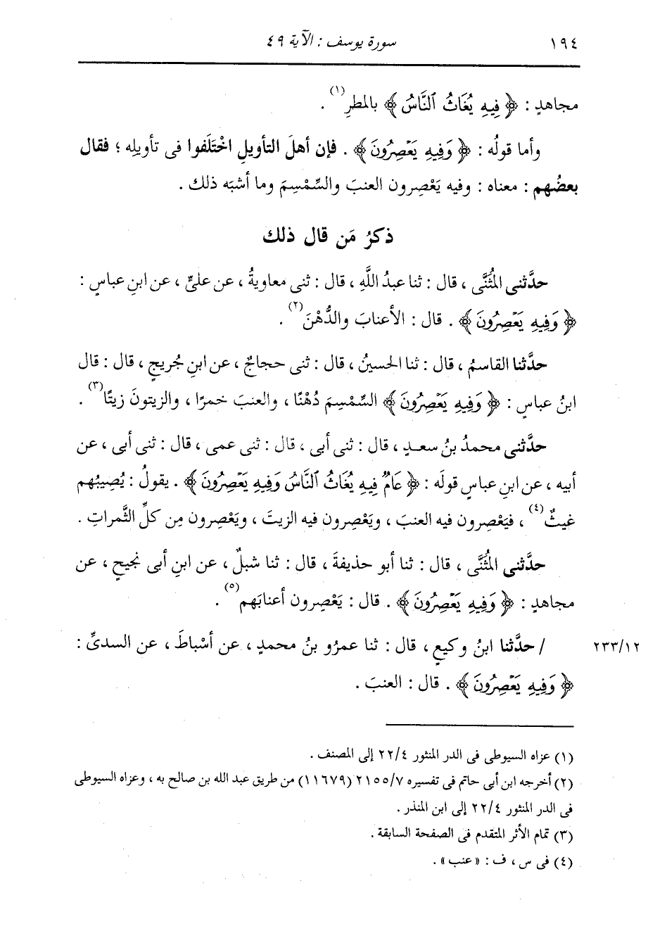 حَدَّثَنِي الْمُثَنَّى، قَالَ: ثَنَا عَبْدُ اللَّهِ، قَالَ: ثَنِي مُعَاوِيَةُ، عَنْ عَلِيٍّ، عَنِ ابْنِ عَبَّاسٍ، " {§وَفِيهِ يَعْصِرُونَ} [يوسف: 49] قَالَ: الْأَعْنَابَ وَالدُّهْنَ "
