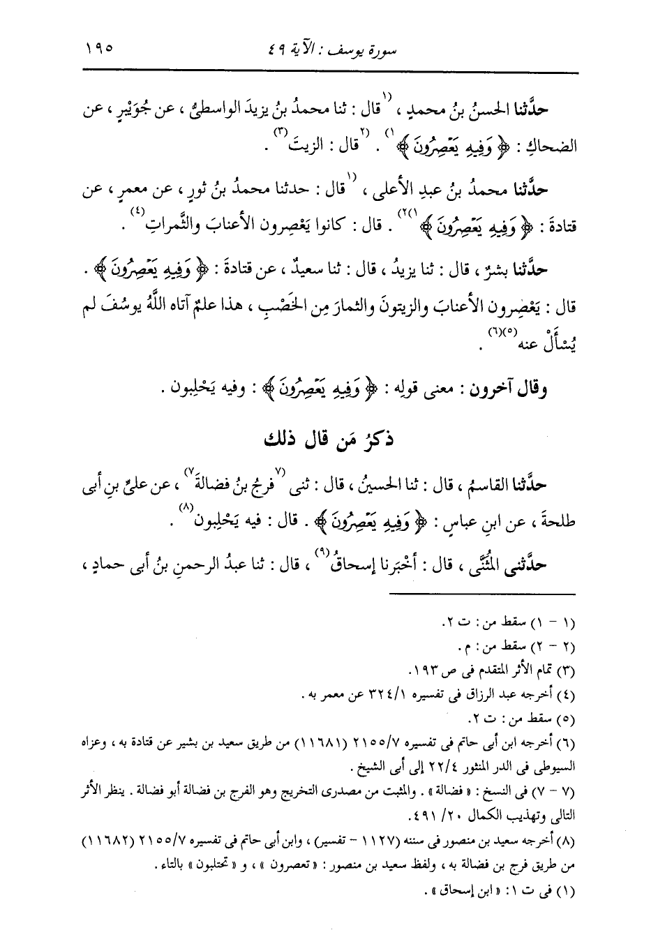 حَدَّثَنَا الْحَسَنُ بْنُ مُحَمَّدٍ، قَالَ: ثَنَا مُحَمَّدُ بْنُ يَزِيدَ الْوَاسِطِيُّ، عَنْ جُوَيْبِرٍ، عَنِ الضَّحَّاكِ، " {§وَفِيهِ يَعْصِرُونَ} [يوسف: 49] قَالَ: كَانُوا يَعْصِرُونَ الْأَعْنَابَ وَالثَّمَرَاتِ "