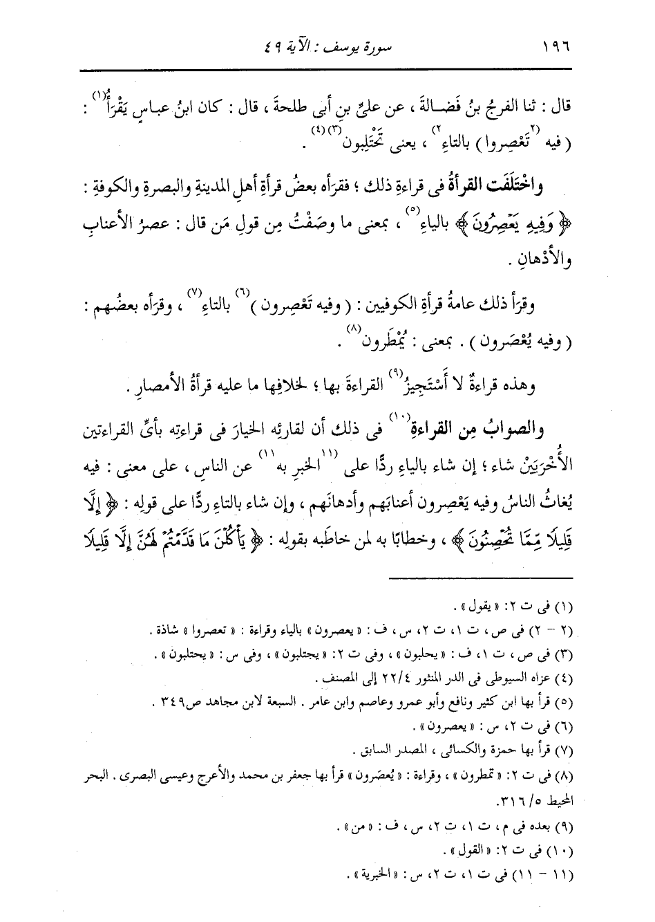 قَالَ: ثَنَا الْفَرَجُ بْنُ فَضَالَةَ، عَنْ عَلِيِّ بْنِ أَبِي طَلْحَةَ، قَالَ: " §كَانَ ابْنُ عَبَّاسٍ يَقْرَأُ: «وَفِيهِ تَعْصِرُونَ» بِالتَّاءِ، يَعْنِي تَحْتَلِبُونَ " وَاخْتَلَفَتِ الْقُرَّاءُ فِي قِرَاءَةِ ذَلِكَ، فَقَرَأَهُ بَعْضُ أَهْلِ الْمَدِينَةِ وَالْبَصْرَةِ وَالْكُوفَةِ: {وَفِيهِ يَعْصِرُونَ} [يوسف: 49] بِالْيَاءِ، بِمَعْنَى مَا وَصَفْتُ مِنْ قَوْلِ مَنْ قَالَ: عَصْرَ الْأَعْنَابِ وَالْأَدْهَانِ. وَقَرَأَ ذَلِكَ عَامَّةُ قُرَّاءِ الْكُوفِيِّينَ: (وَفِيهِ تَعْصِرُونَ) بِالتَّاءِ. وَقَرَأَهُ بَعْضُهُمْ: «وَفِيهِ يُعْصَرُونَ» بِمَعْنَى: يُمْطَرُونَ، وَهَذِهِ قِرَاءَةٌ لَا أَسْتَجِيزُ الْقِرَاءَةَ بِهَا لِخِلَافِهَا مَا عَلَيْهِ مِنْ قُرَّاءِ الْأَمْصَارِ وَالصَّوَابُ مِنَ الْقِرَاءَةِ فِي ذَلِكَ أَنَّ لِقَارِئِهِ الْخِيَارَ فِي قِرَاءَتِهِ بِأَيِّ الْقِرَاءَتَيْنِ الْأُخْرَيَيْنِ شَاءَ، إِنْ شَاءَ بِالْيَاءِ رَدًّا عَلَى الْخَبَرِ بِهِ عَنِ النَّاسِ، عَلَى مَعْنَى: {فِيهِ يُغَاثُ النَّاسُ وَفِيهِ يَعْصِرُونَ} [يوسف: 49] أَعْنَابَهُمْ وَأَدْهَانَهُمْ. وَإِنْ شَاءَ بِالتَّاءِ رَدًّا عَلَى قَوْلِهِ: {إِلَّا قَلِيلًا مِمَّا تُحْصِنُونَ} [يوسف: 48] وَخِطَابًا بِهِ لِمَنْ خَاطَبَهُ بِقَوْلِهِ: {يَأْكُلْنَ مَا قَدَّمْتُمْ لَهُنَّ إِلَّا قَلِيلًا