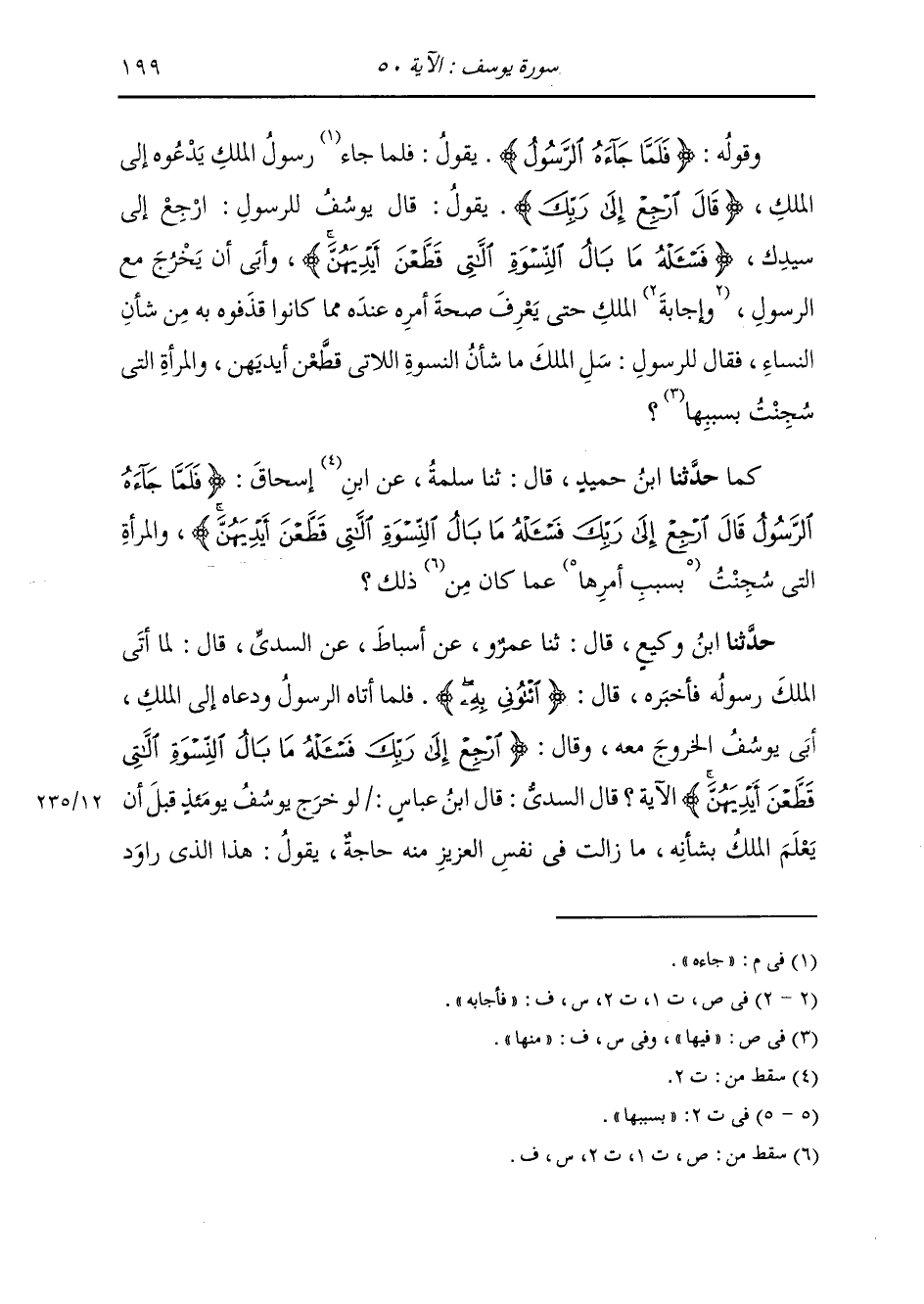 كَمَا: حَدَّثَنَا ابْنُ حُمَيْدٍ، قَالَ: ثَنَا سَلَمَةُ، عَنِ ابْنِ إِسْحَاقَ، " {§فَلَمَّا جَاءَهُ الرَّسُولُ قَالَ ارْجِعْ إِلَى رَبِّكَ فَاسْأَلْهُ مَا بَالُ النِّسْوَةِ اللَّاتِي قَطَّعْنَ أَيْدِيَهُنَّ} [يوسف: 50] وَالْمَرْأَةِ الَّتِي سُجِنْتُ بِسَبَبِ أَمْرِهَا عَمَّا كَانَ مِنْ ذَلِكَ "