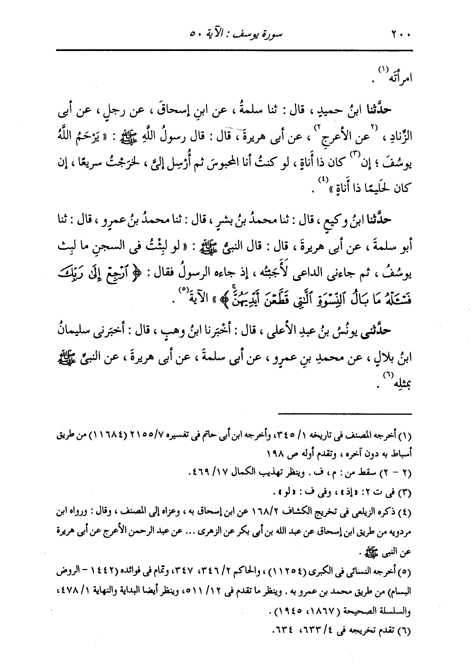 حَدَّثَنَا ابْنُ حُمَيْدٍ، قَالَ: ثَنَا سَلَمَةُ، عَنِ ابْنِ إِسْحَاقَ، عَنْ رَجُلٍ، عَنْ أَبِي الزِّنَادِ، عَنْ أَبِي هُرَيْرَةَ، قَالَ: قَالَ رَسُولُ اللَّهِ صَلَّى اللهُ عَلَيْهِ وَسَلَّمَ: «§يَرْحَمُ اللَّهُ يُوسُفَ إِنْ كَانَ ذَا أَنَاةٍ، لَوْ كُنْتُ أَنَا الْمَحْبُوسُ، ثُمَّ أَرْسَلَ إِلَيَّ لَخَرَجْتُ سَرِيعًا، إِنْ كَانَ لَحَلِيمًا ذَا أَنَاةٍ»