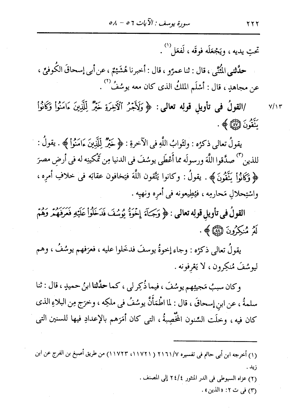 حَدَّثَنِي الْمُثَنَّى، قَالَ: ثنا عَمْرٌو، قَالَ: أَخْبَرَنَا هُشَيْمٌ، عَنْ أَبِي إِسْحَاقَ الْكُوفِيِّ، عَنْ مُجَاهِدٍ، قَالَ: «§أَسْلَمَ الْمَلِكُ الَّذِي كَانَ مَعَهُ يُوسُفَ»