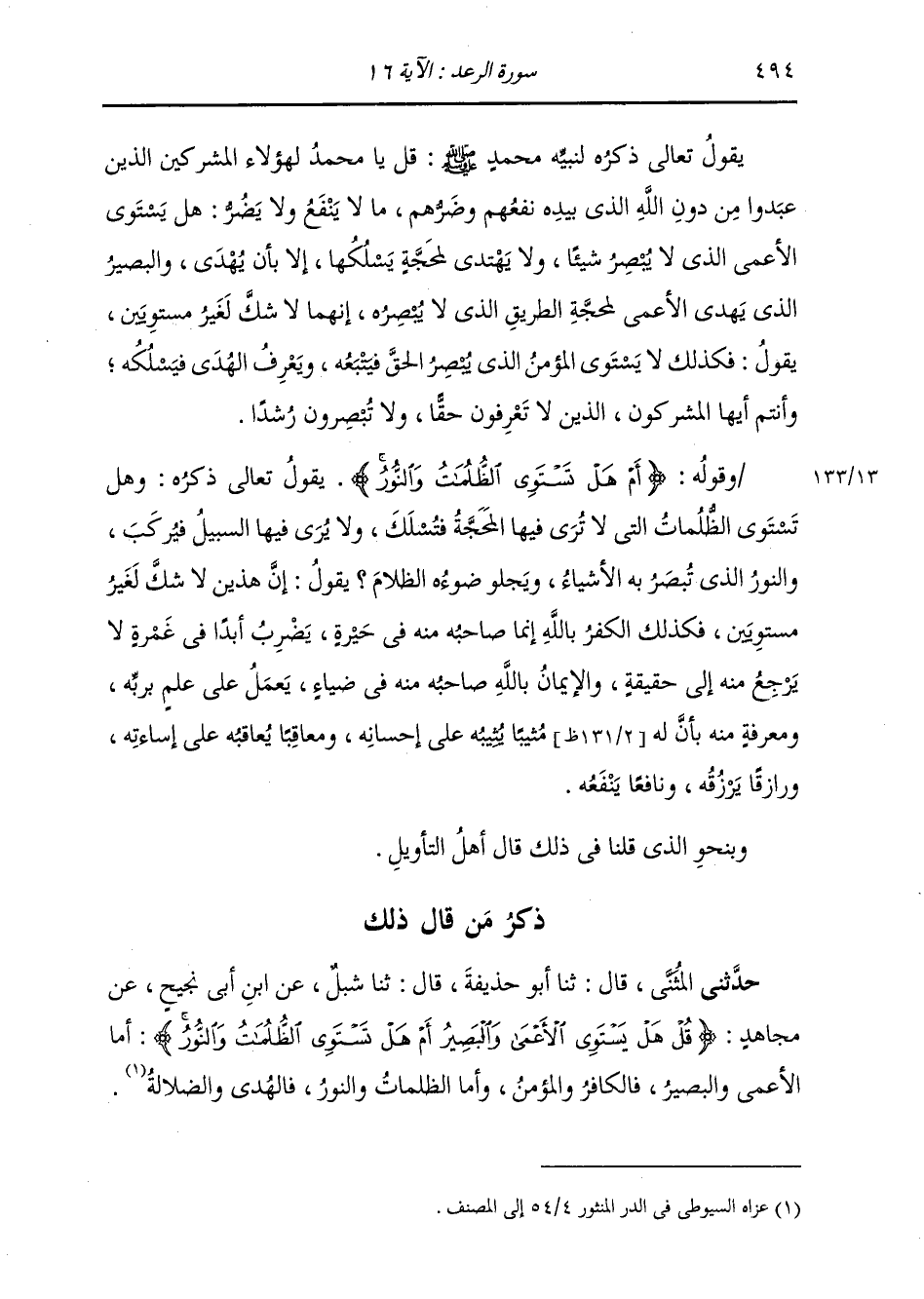 ذِكْرُ مَنْ قَالَ ذَلِكَ: حَدَّثني الْمُثَنَّى، قَالَ: ثنا أَبُو حُذَيْفَةَ، قَالَ: ثنا شِبْلٌ، عَنِ ابْنِ أَبِي نَجِيحٍ، عَنْ مُجَاهِدٍ: {§قُلْ هَلْ يَسْتَوِي الْأَعْمَى وَالْبَصِيرُ أَمْ هَلْ تَسْتَوِي الظُّلُمَاتُ وَالنُّورُ} [الرعد: 16] «أَمَّا الْأَعْمَى وَالْبَصِيرُ فَالْكَافِرُ وَالْمُؤْمِنُ؛ وَأَمَّا الظُّلُمَاتُ وَالنُّورُ فَالْهُدَى وَالضَّلَالَةُ»
