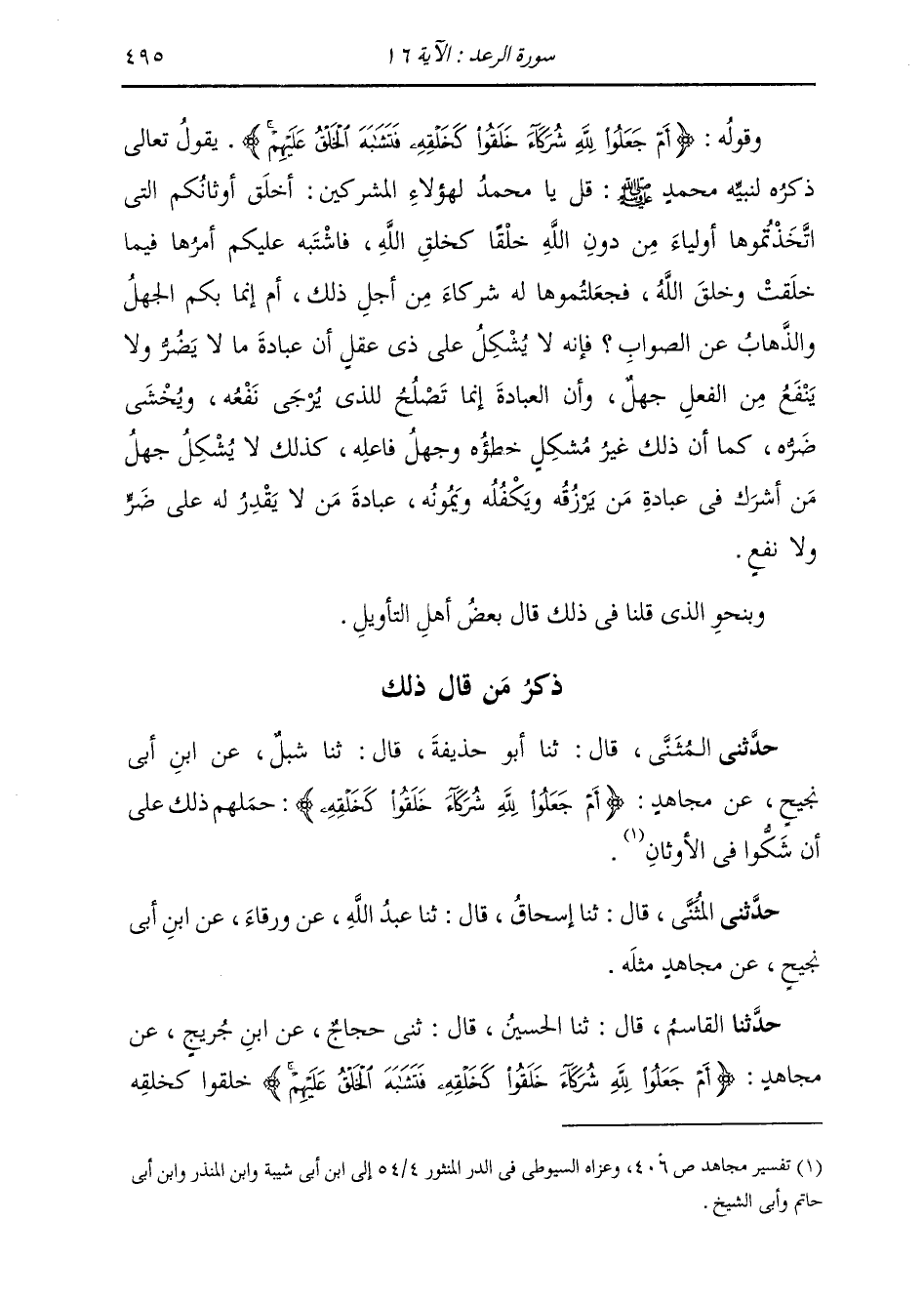 حَدَّثَنَا الْقَاسِمُ قَالَ: ثنا الْحُسَيْنُ قَالَ: ثني حَجَّاجٌ، عَنِ ابْنِ جُرَيْجٍ، عَنْ مُجَاهِدٍ: " {§أَمْ جَعَلُوا للَّهِ شُرَكَاءَ خَلَقُوا كَخَلْقِهِ فَتَشَابَهَ الْخَلْقُ عَلَيْهِمْ} [الرعد: 16] خَلَقُوا كَخَلْقِهِ، -[496]- فَحَمَلَهُمْ ذَلِكَ عَلَى أَنْ شَكُّوا فِي الْأَوْثَانِ ". حَدَّثَنَا الْحَسَنُ بْنُ مُحَمَّدٍ قَالَ: ثنا شَبَابَةُ قَالَ: ثنا وَرْقَاءُ، عَنِ ابْنِ أَبِي نَجِيحٍ، عَنْ مُجَاهِدٍ، مِثْلَهُ