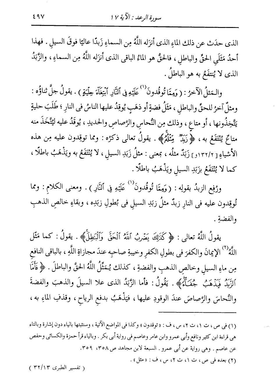 الَّذِي حَدَثَ عَنْ ذَلِكَ الْمَاءِ الَّذِي أَنْزَلَهُ اللَّهُ مِنَ السَّمَاءِ زَبَدًا عَالِيًا فَوْقَ السَّيْلِ، فَهَذَا أَحَدُ مَثَلَيِ الْحَقِّ وَالْبَاطِلِ، فَالْحَقُّ هُوَ الْمَاءُ الْبَاقِي الَّذِي أَنْزَلَهُ اللَّهُ مِنَ السَّمَاءِ، وَالزَّبَدُ الَّذِي لَا يُنْتَفَعُ بِهِ هُوَ الْبَاطِلُ، وَالْمَثَلُ الْآخَرُ: {وَمِمَّا يُوقِدُونَ عَلَيْهِ فِي النَّارِ ابْتِغَاءَ حِلْيَةٍ} [الرعد: 17] يَقُولُ جَلَّ ثَنَاؤُهُ: وَمَثَلٌ آخَرُ لِلْحَقِّ وَالْبَاطِلِ، مَثَلُ فِضَّةٍ أَوْ ذَهَبٍ يُوقِدُ عَلَيْهَا النَّاسُ فِي النَّارِ طَلَبَ حِلْيَةٍ يَتَّخِذُونَهَا أَوْ مَتَاعٍ، وَذَلِكَ مِنَ النُّحَاسِ وَالرَّصَاصِ وَالْحَدِيدِ، يُوقَدُ عَلَيْهِ لِيُتَّخَذَ مِنْهُ مَتَاعٌ يُنْتَفَعُ بِهِ، {زَبَدٌ مِثْلُهُ} [الرعد: 17] . يَقُولُ تَعَالَى ذِكْرُهُ: وَمِمَّا يُوقِدُونَ عَلَيْهِ مِنْ هَذِهِ الْأَشْيَاءِ زَبَدٌ مِثْلُهُ، بِمَعْنَى: مِثْلُ زَبَدِ السَّيْلِ، لَا يُنْتَفَعُ بِهِ وَيَذْهَبُ بَاطِلًا، كَمَا لَا يُنْتَفَعُ بِزَبَدِ السَّيْلِ وَيَذْهَبُ بَاطِلًا، وَرَفَعَ {الزَّبَدُ} [الرعد: 17] بِقَوْلِهِ: {وَمِمَّا يُوقِدُونَ عَلَيْهِ فِي النَّارِ} [الرعد: 17] وَمَعْنَى الْكَلَامِ: وَمِمَّا يُوقِدُونَ عَلَيْهِ فِي النَّارِ زَبَدٌ مِثْلُ زَبَدِ السَّيْلِ فِي بِطُولِ زَبَدِهِ، وَبَقَاءِ خَالِصِ الذَّهَبِ وَالْفِضَّةِ، يَقُولُ اللَّهُ تَعَالَى: {كَذَلِكَ يَضْرِبُ اللَّهُ الْحَقَّ وَالْبَاطِلَ} [الرعد: 17] يَقُولُ: كَمَا مَثَّلَ اللَّهُ الْإِيمَانَ وَالْكُفْرَ فِي بِطُولِ الْكُفْرِ وَخَيْبَةِ صَاحِبِهِ عِنْدَ مُجَازَاةِ اللَّهِ بِالْبَاقِي النَّافِعِ مِنْ مَاءِ السَّيْلِ وَخَالِصِ الذَّهَبِ وَالْفِضَّةِ، كَذَلِكَ يُمَثِّلُ اللَّهُ الْحَقَّ وَالْبَاطِلَ {فَأَمَّا الزَّبَدُ فَيَذْهَبُ جُفَاءً} [الرعد: 17] يَقُولُ: فَأَمَّا الزَّبَدُ الَّذِي عَلَا السَّيْلَ، وَالذَّهَبُ وَالْفِضَّةُ وَالنُّحَاسُ وَالرَّصَاصُ عِنْدَ الْوَقُودِ عَلَيْهَا، فَيَذْهَبُ بِدَفْعِ الرِّيَاحِ وَقَذْفِ الْمَاءِ بِهِ